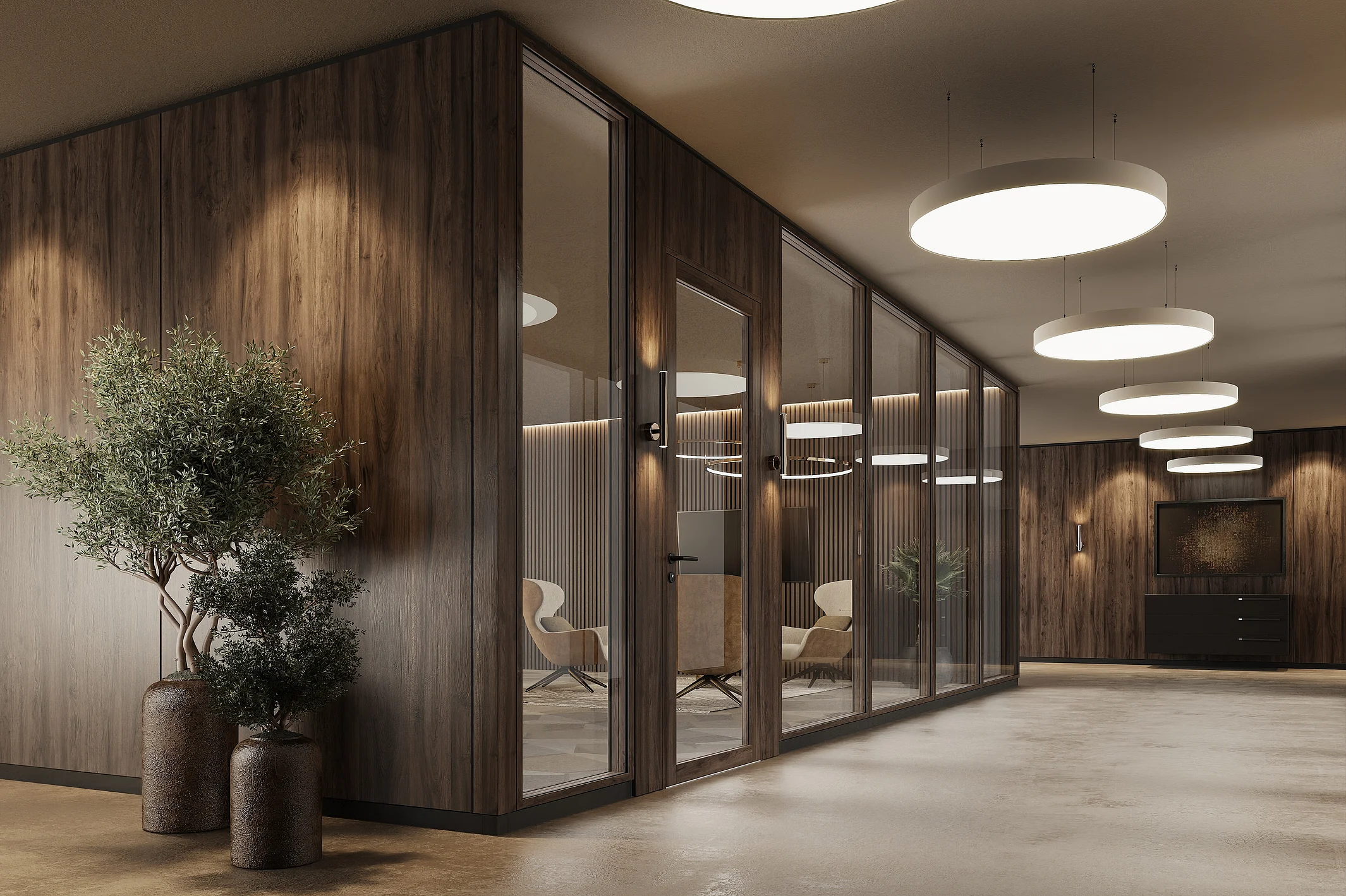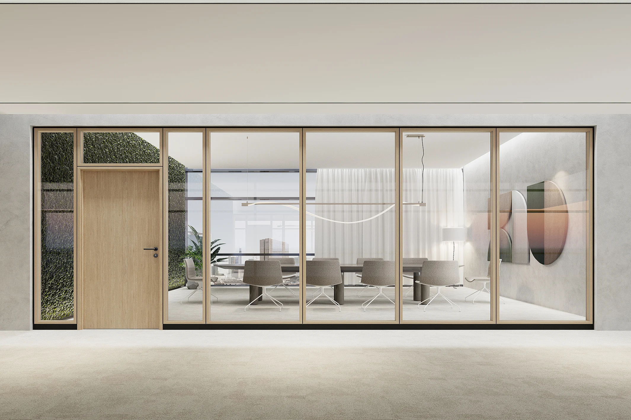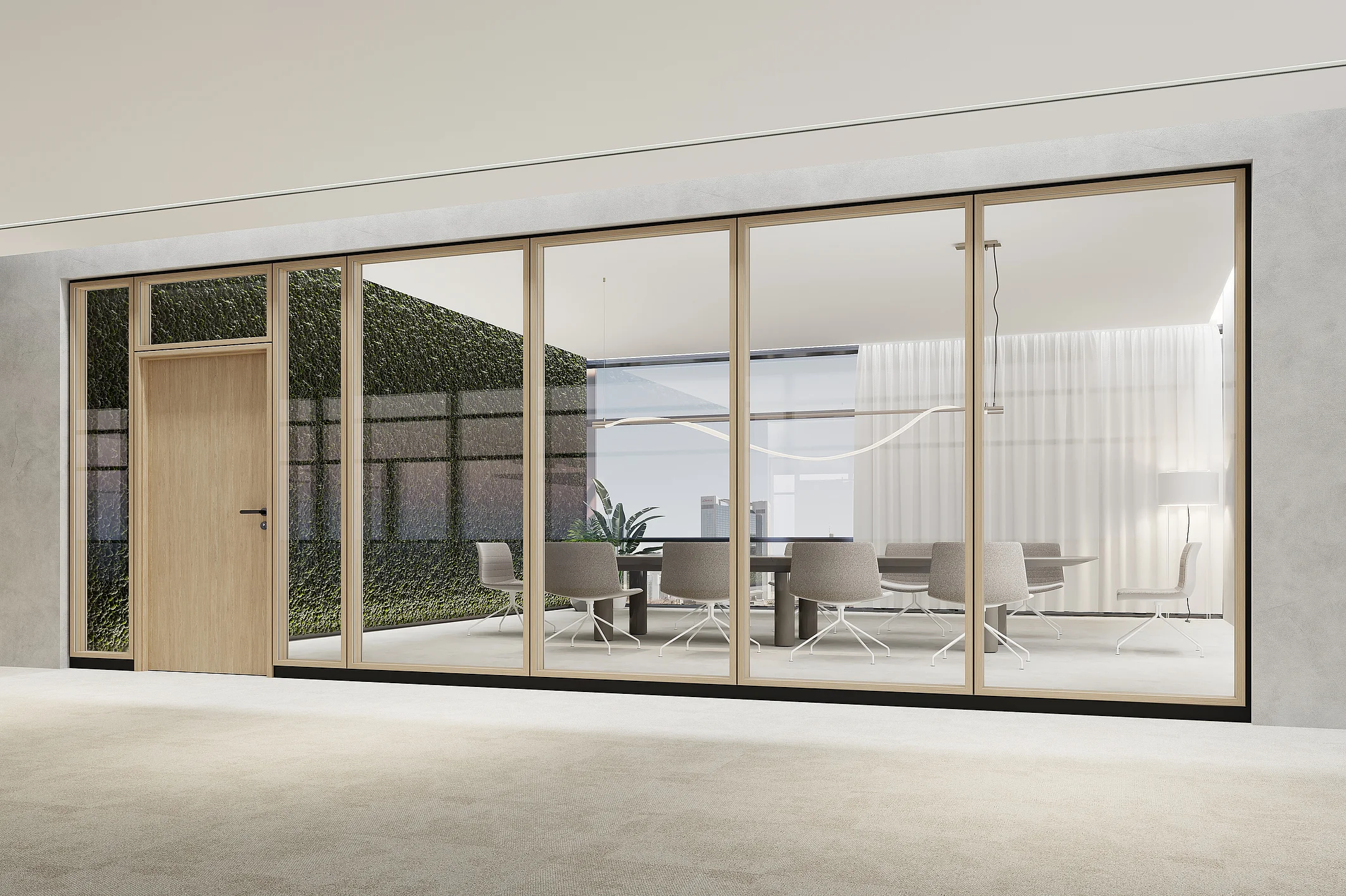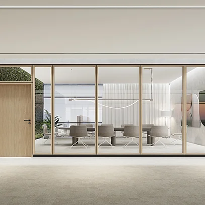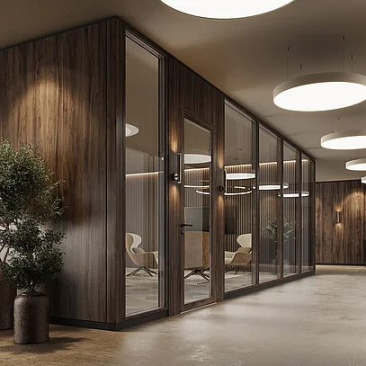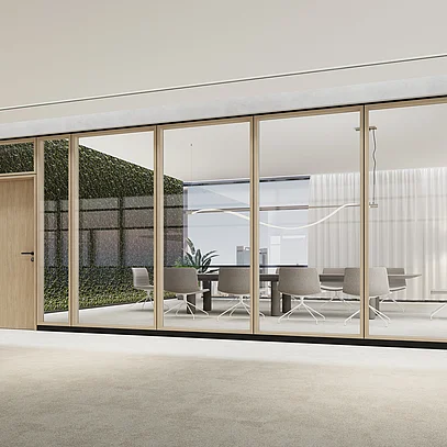 The T34 NATURE is a highly flexible partition wall system. Its key feature is the solid wood profiles with a face width of 34 mm. The system can be configured in flexible width increments and room heights. A variety of glass types and custom finishes allow for personalized