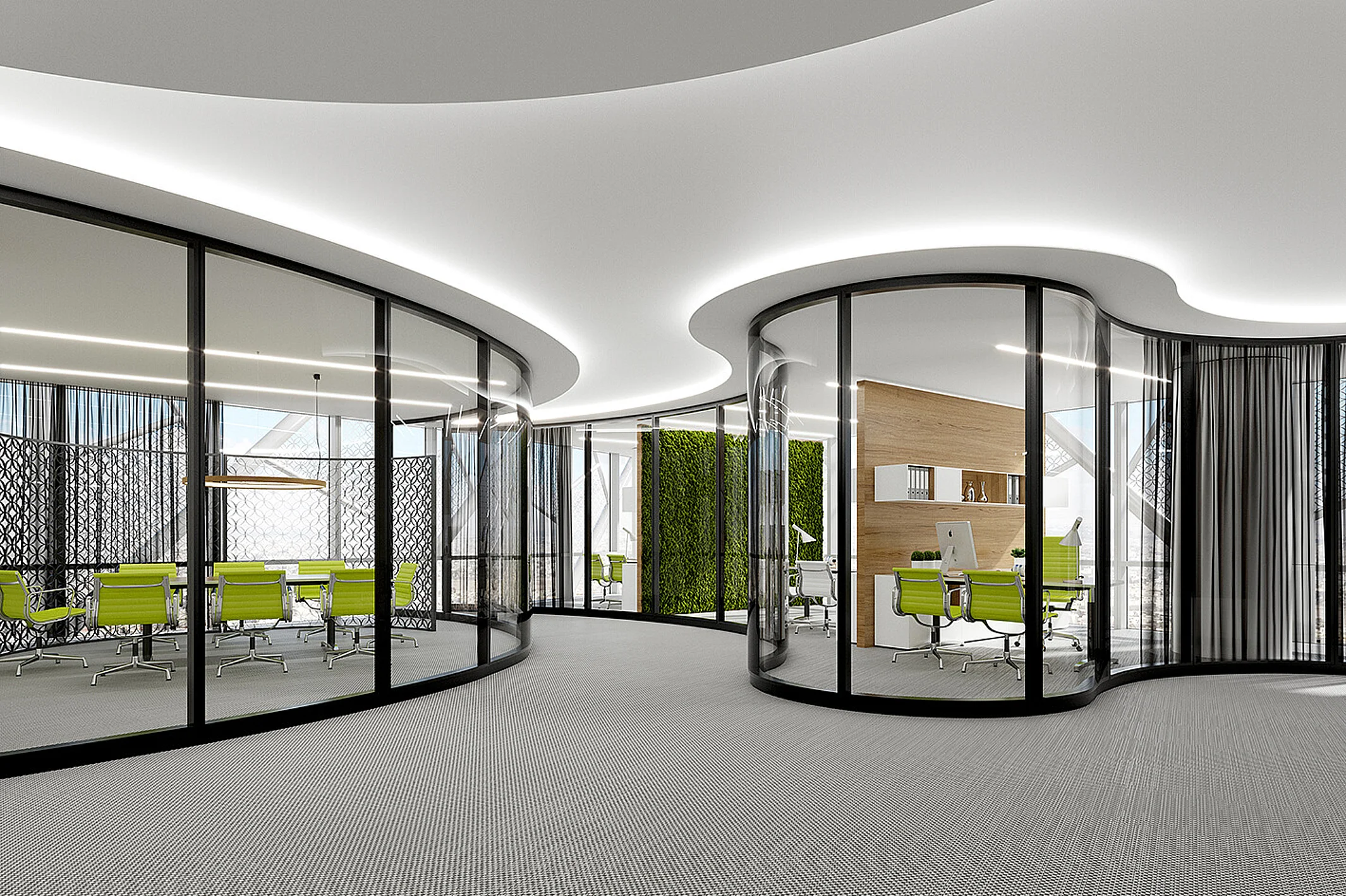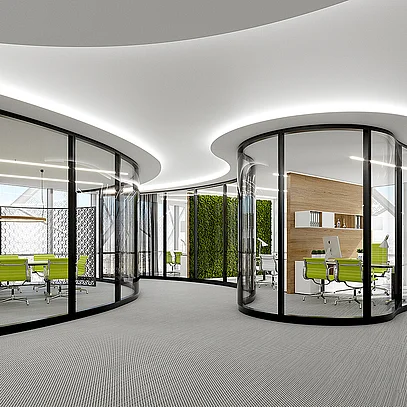 The elegant T65, featuring bonded glazing, offers all the benefits of flexible partition wall systems. With no visible frame, the wall system stands out thanks to its flush bonding using the “structural glazing” method. The bonding is available in either black or gray. For architects and designers, this means greater design freedom. The materials used meet sustainability standards and can be combined with all Goldbach Kirchner partition wall systems.
