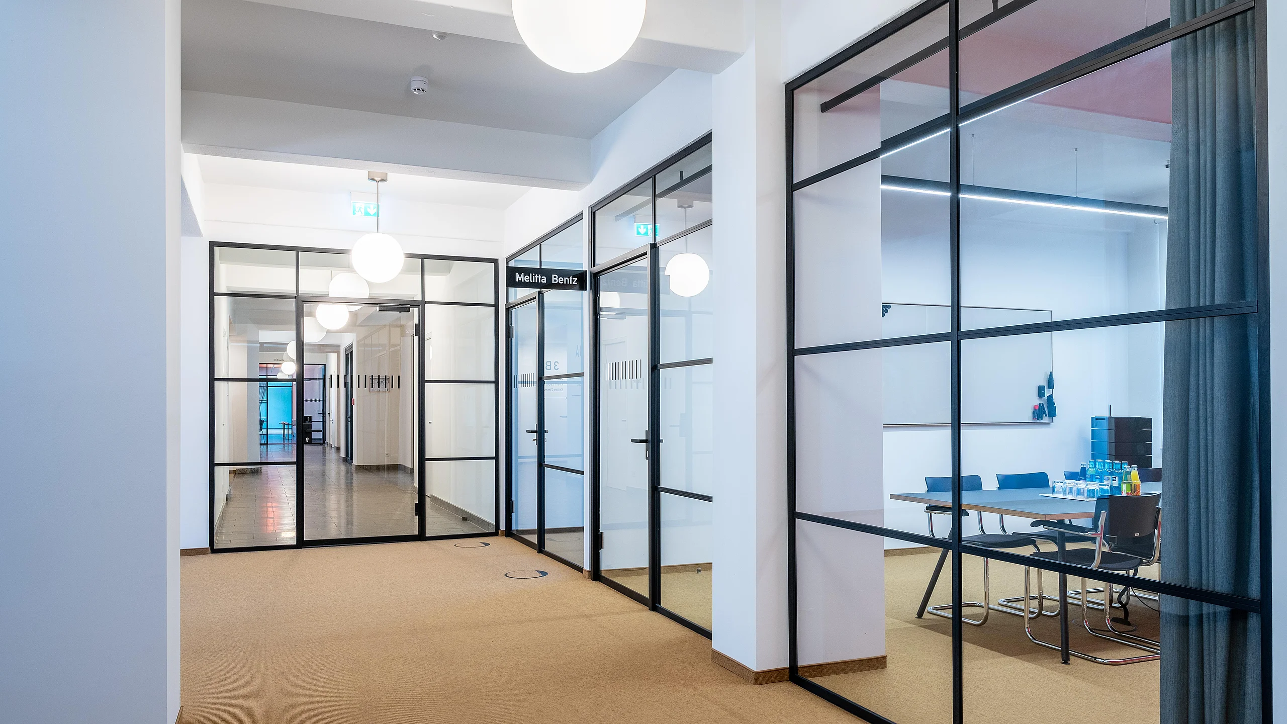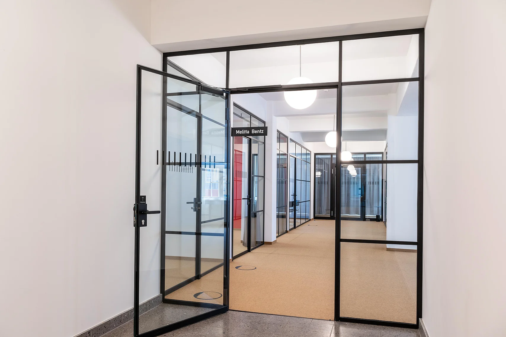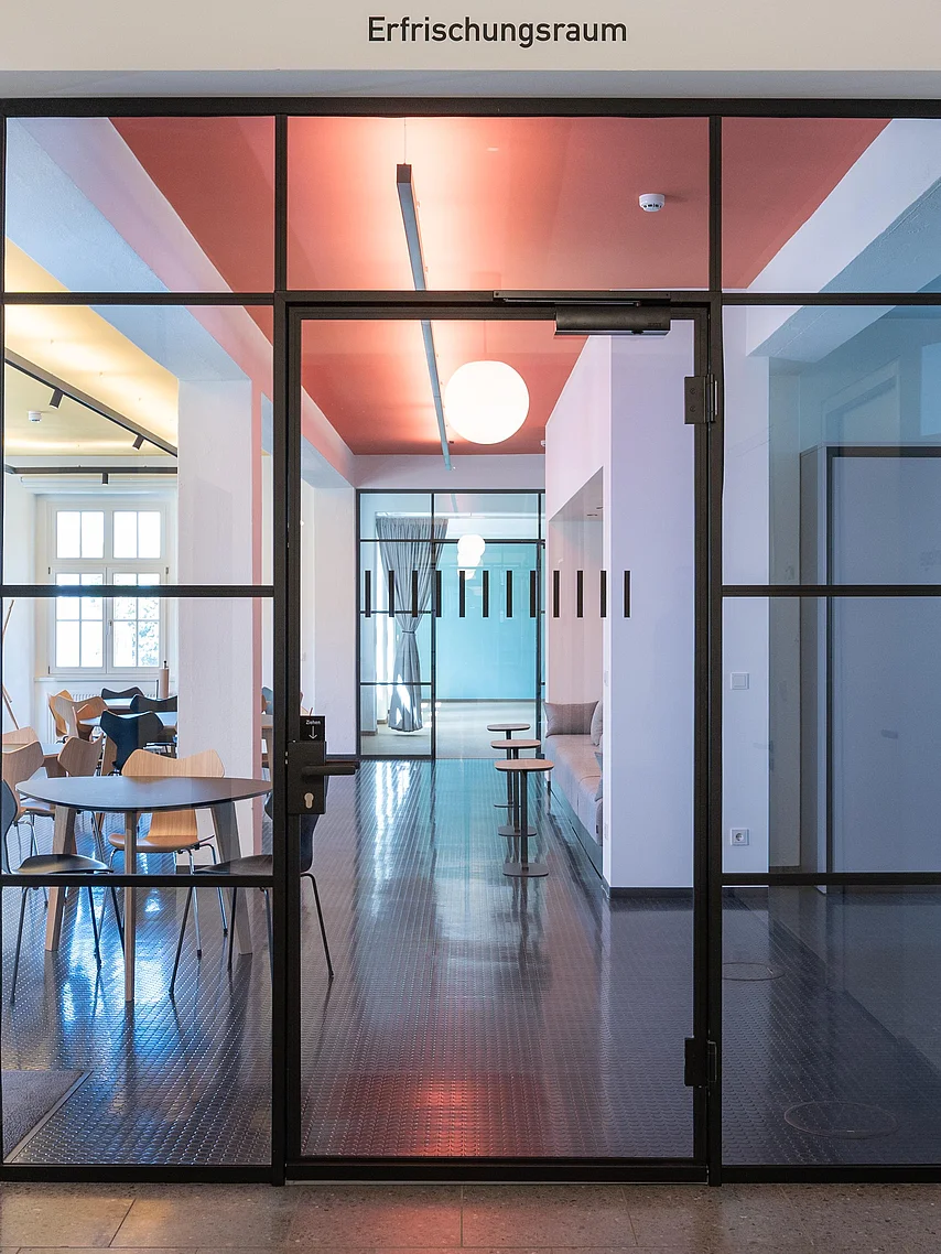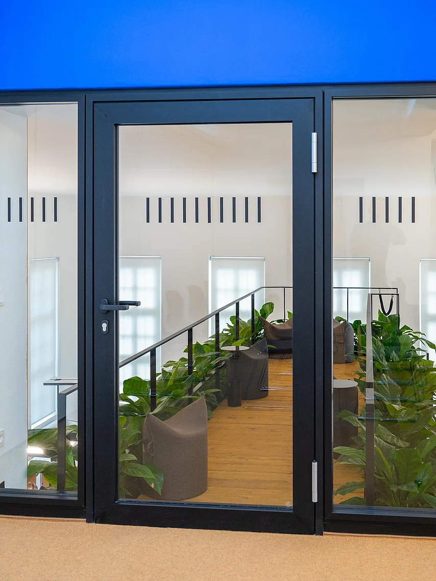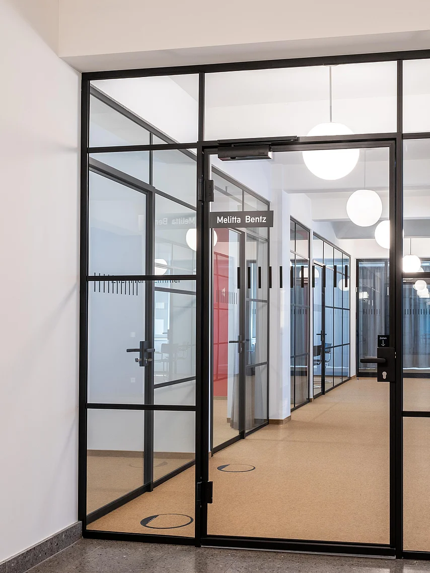 Die Glastrennwände und -türen von Goldbach Kirchner passen stilistisch in das Gebäude und sorgen für ein vielfältiges Raumangebot.