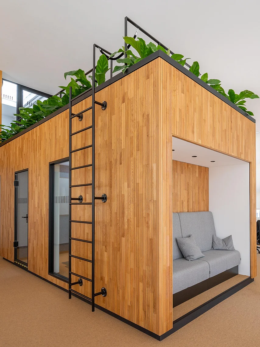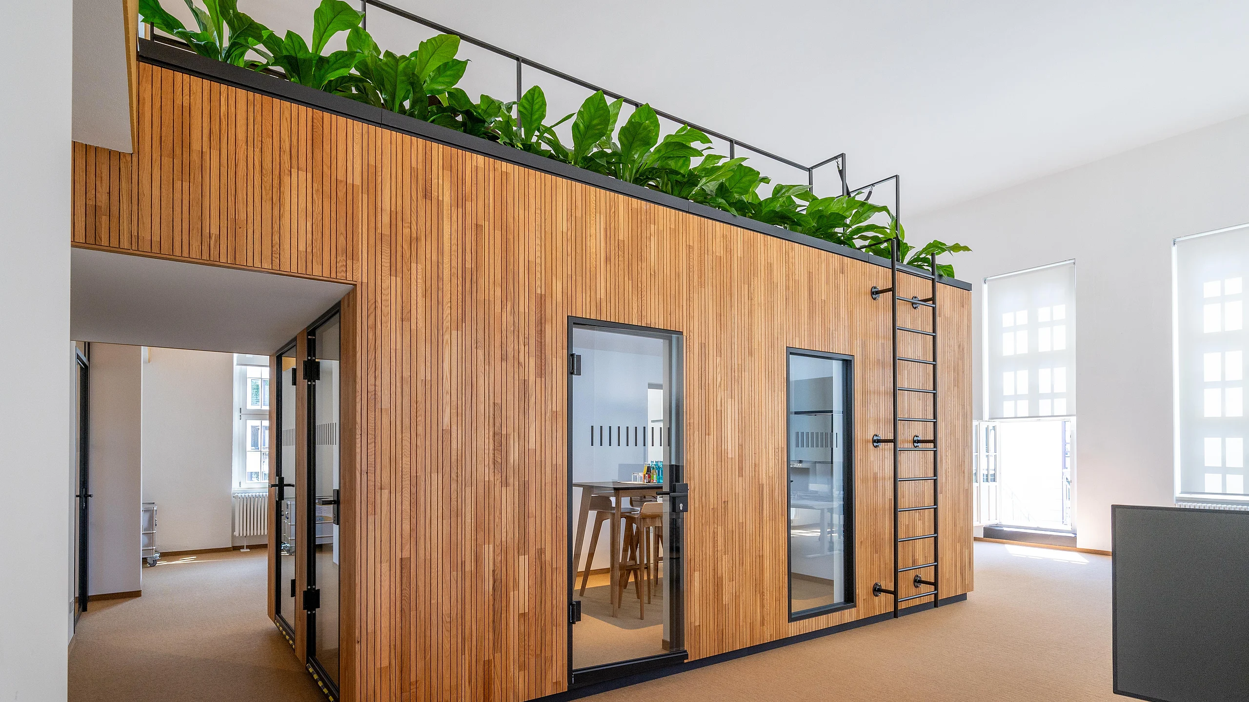 Ein Hingucker ist das als Raum-in-Raum-Lösung geplante Besprechungszimmer mit Holzfassade. Darin sind Ganzglastüren und Fenster aus dem Trennwand-System T46 von Goldbach Kirchner verbaut. Aus dem zweiten Stock lässt sich das begrünte Dach durch eine Alurohrrahmentür betreten. Die Materialien von Türen und Trennwänden können sortenrein getrennt, wiederverwendet und recycelt werden. Das schont Ressourcen und trägt zur Nachhaltigkeit des gesamten Projekts bei. Stilvolle Details wie die Linoleum-Oberflächen der Tische sind eine Referenz an die Entstehungszeit des Baus.