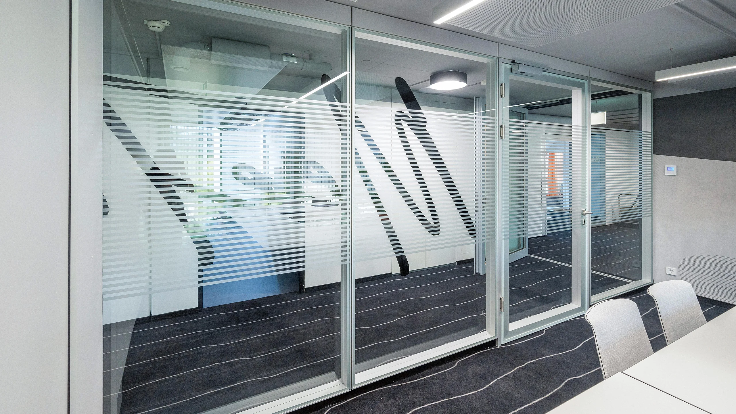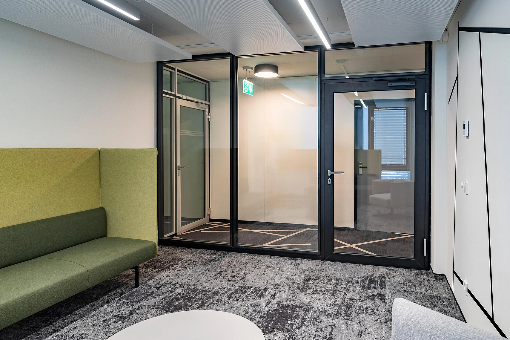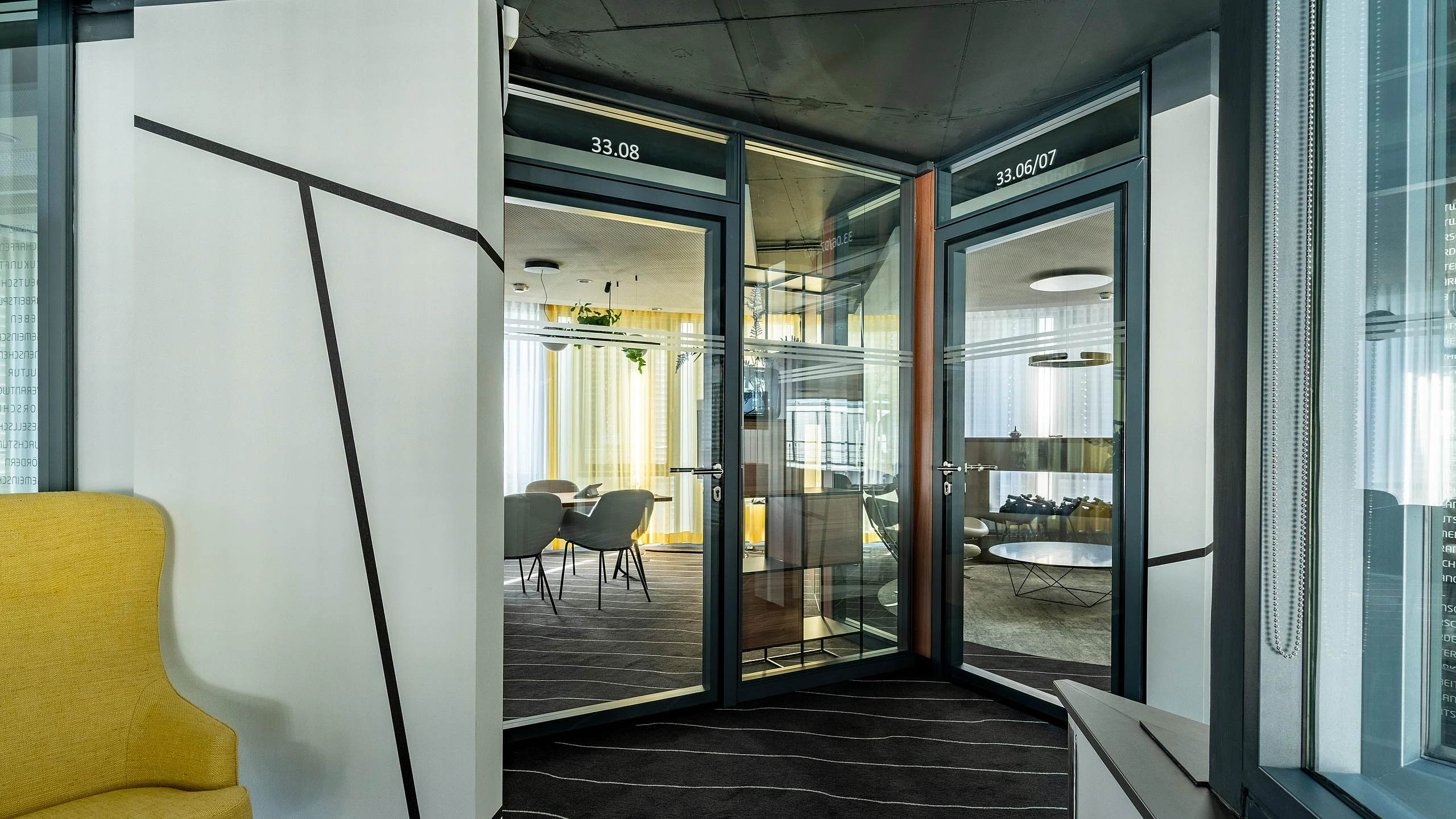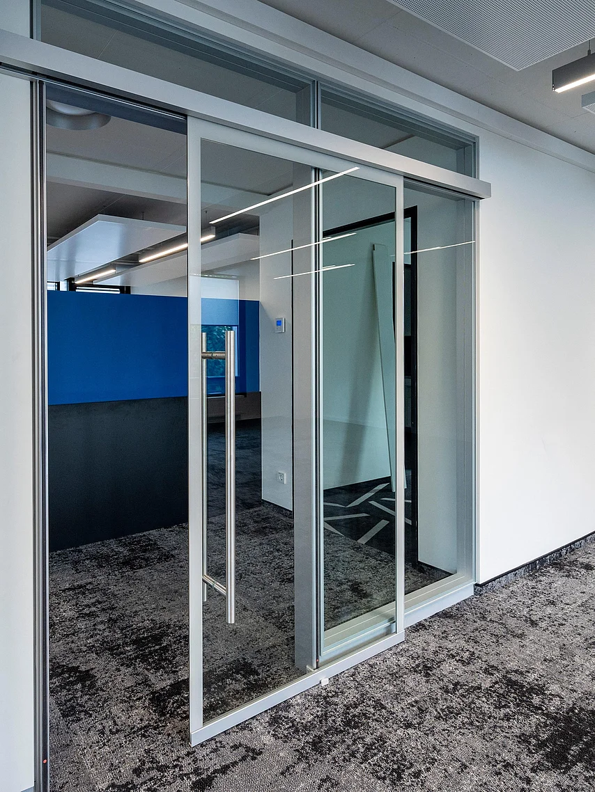 Ein weiteres Highlight des Projekts ist das Trennwand-System T35, das in den Büros mit 100 mm Alu-Rahmentüren integriert wurde. Diese Türen wurden in verschiedenen Varianten umgesetzt, teils mit Oberblende und teils mit T10-Wänden. Die Alu-Rohrrahmentüren mit integrierten Schalterpaneelen ermöglichen eine präzise Steuerung der Bürofunktionen und erhöhen so die Nutzungseffizienz. Zusätzlich wurden in den Besprechungsräumen die T35-Systeme mit Ganzglas-Schallschutz-Schiebetüren verwendet. Diese Eigenentwicklung von Goldbach Kirchner erreicht die Schallschutzklasse 2 mit 37 dB, was den akustischen Anforderungen gerecht wird und für eine ruhige und konzentrierte Arbeitsumgebung sorgt.