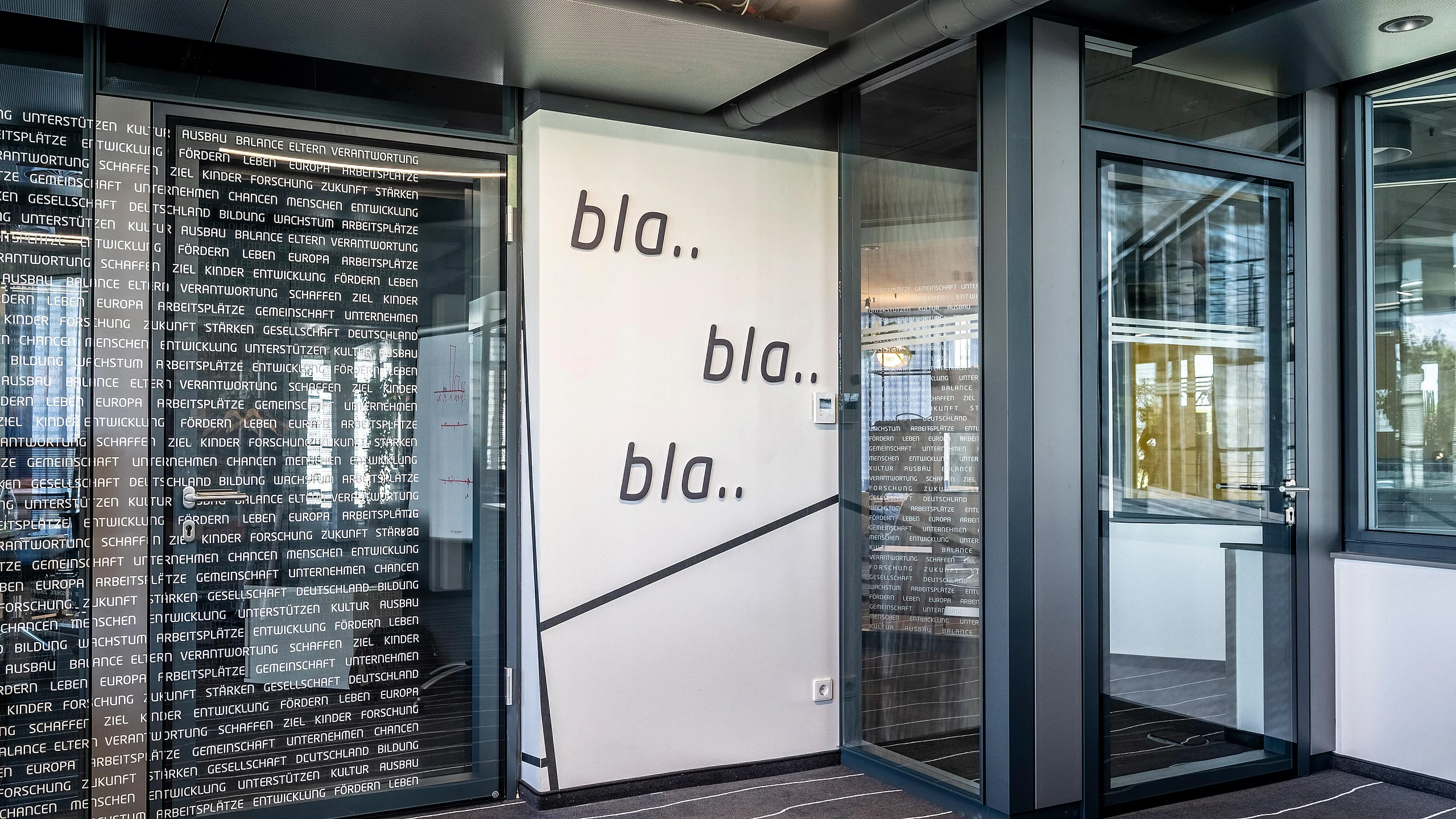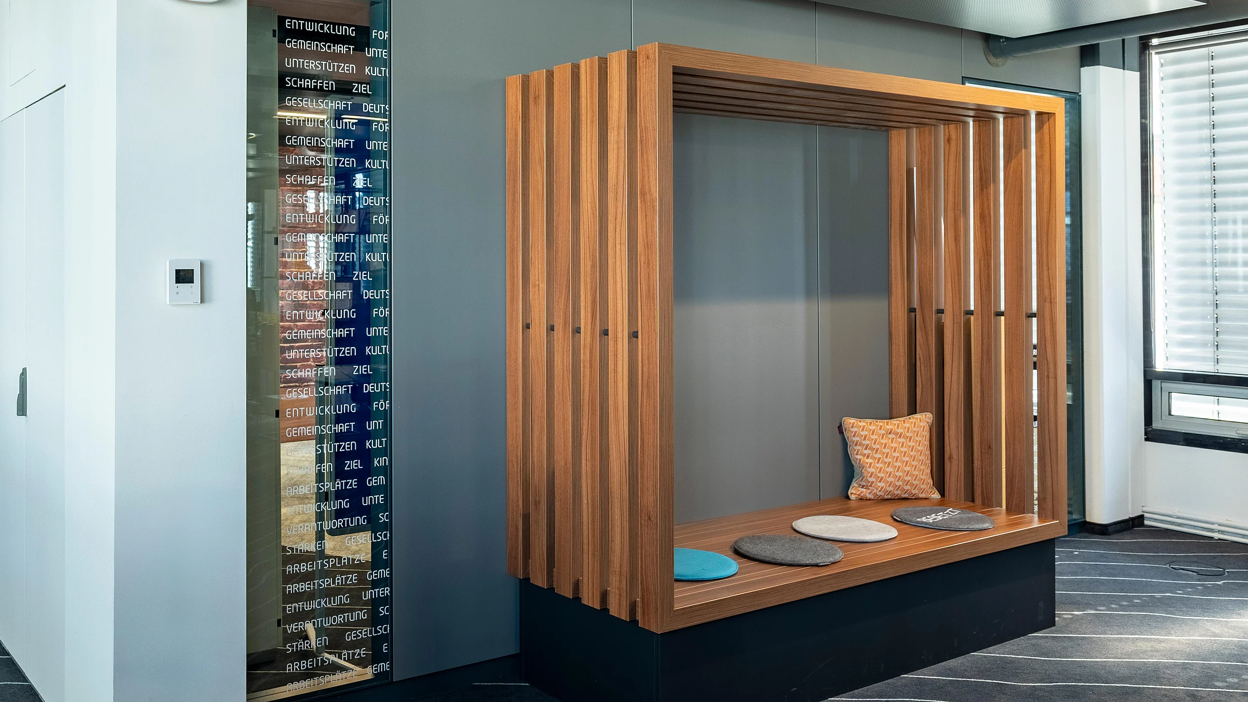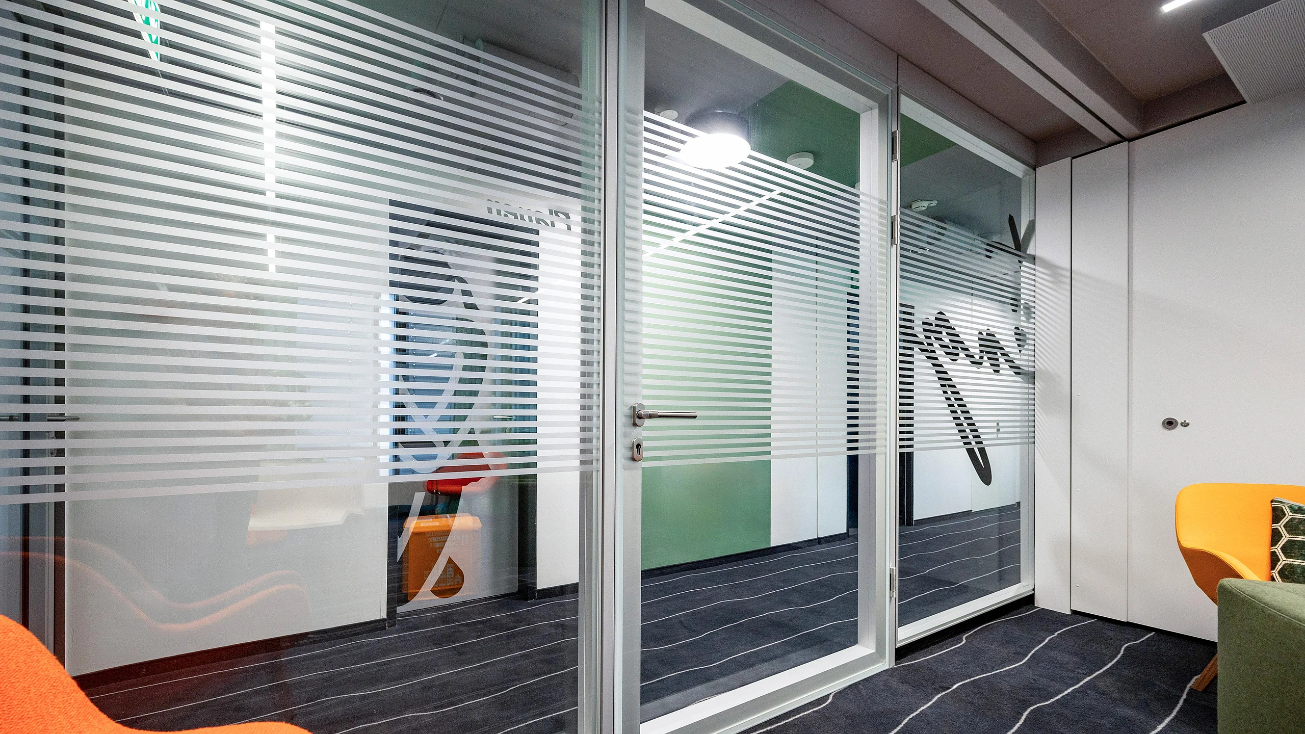Ein weiteres Highlight des Projekts ist das Trennwand-System T35, das in den Büros mit 100 mm Alu-Rahmentüren integriert wurde. Diese Türen wurden in verschiedenen Varianten umgesetzt, teils mit Oberblende und teils mit T10-Wänden. Die Alu-Rohrrahmentüren mit integrierten Schalterpaneelen ermöglichen eine präzise Steuerung der Bürofunktionen und erhöhen so die Nutzungseffizienz. Zusätzlich wurden in den Besprechungsräumen die T35-Systeme mit Ganzglas-Schallschutz-Schiebetüren verwendet. Diese Eigenentwicklung von Goldbach Kirchner erreicht die Schallschutzklasse 2 mit 37 dB, was den akustischen Anforderungen gerecht wird und für eine ruhige und konzentrierte Arbeitsumgebung sorgt.