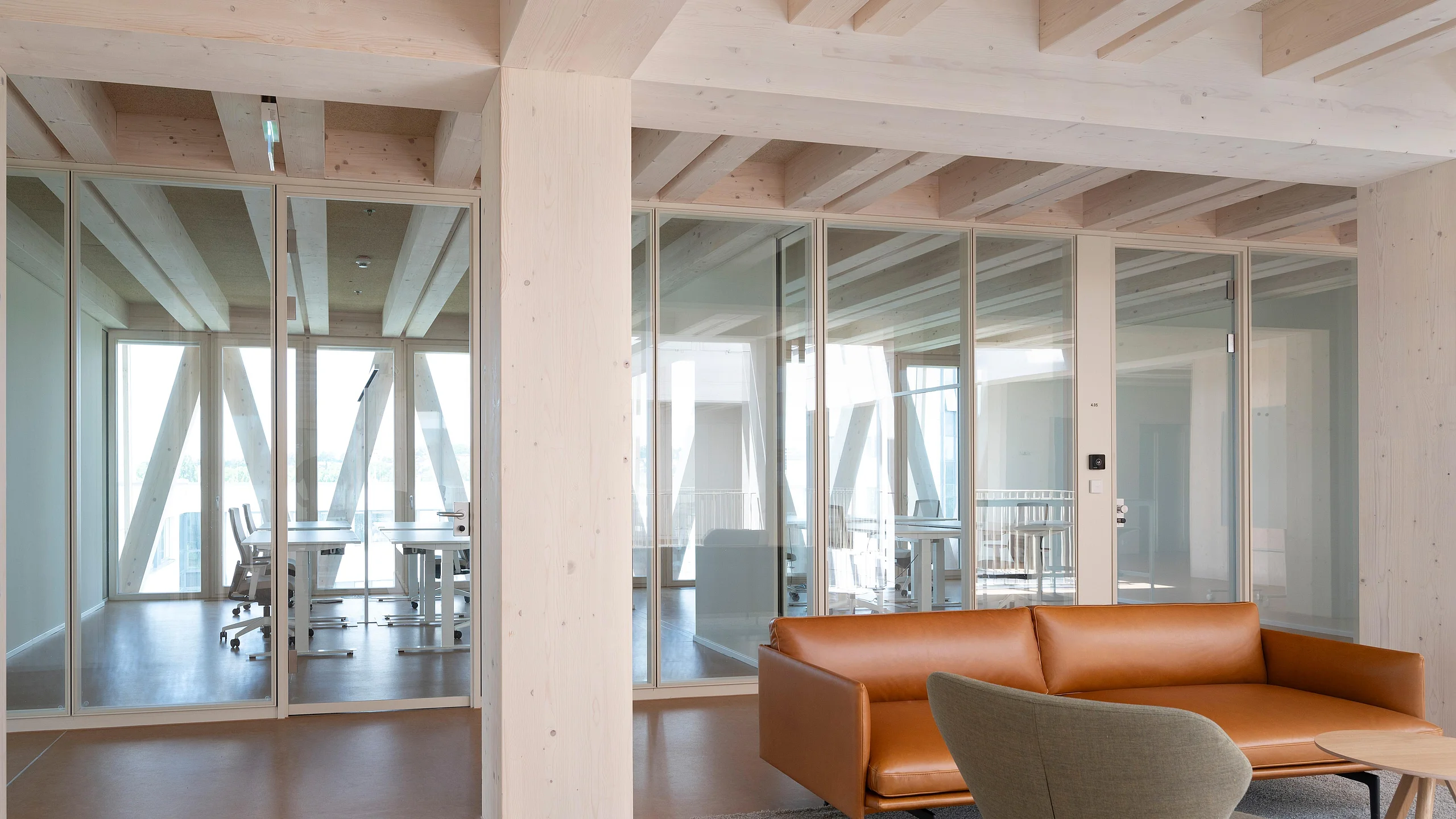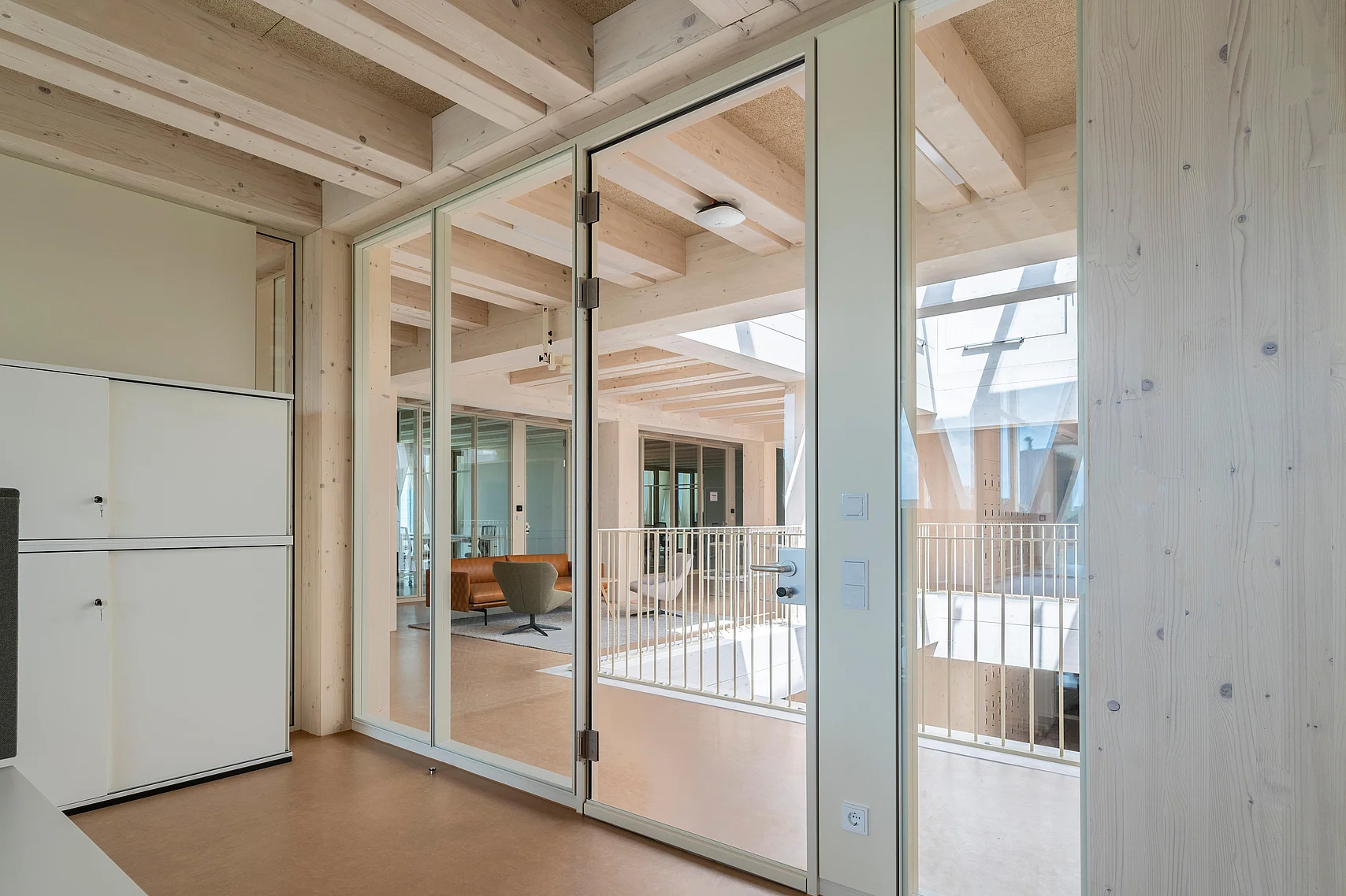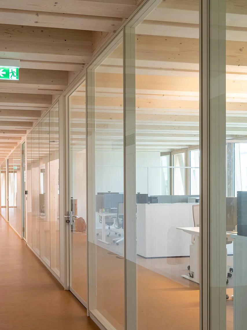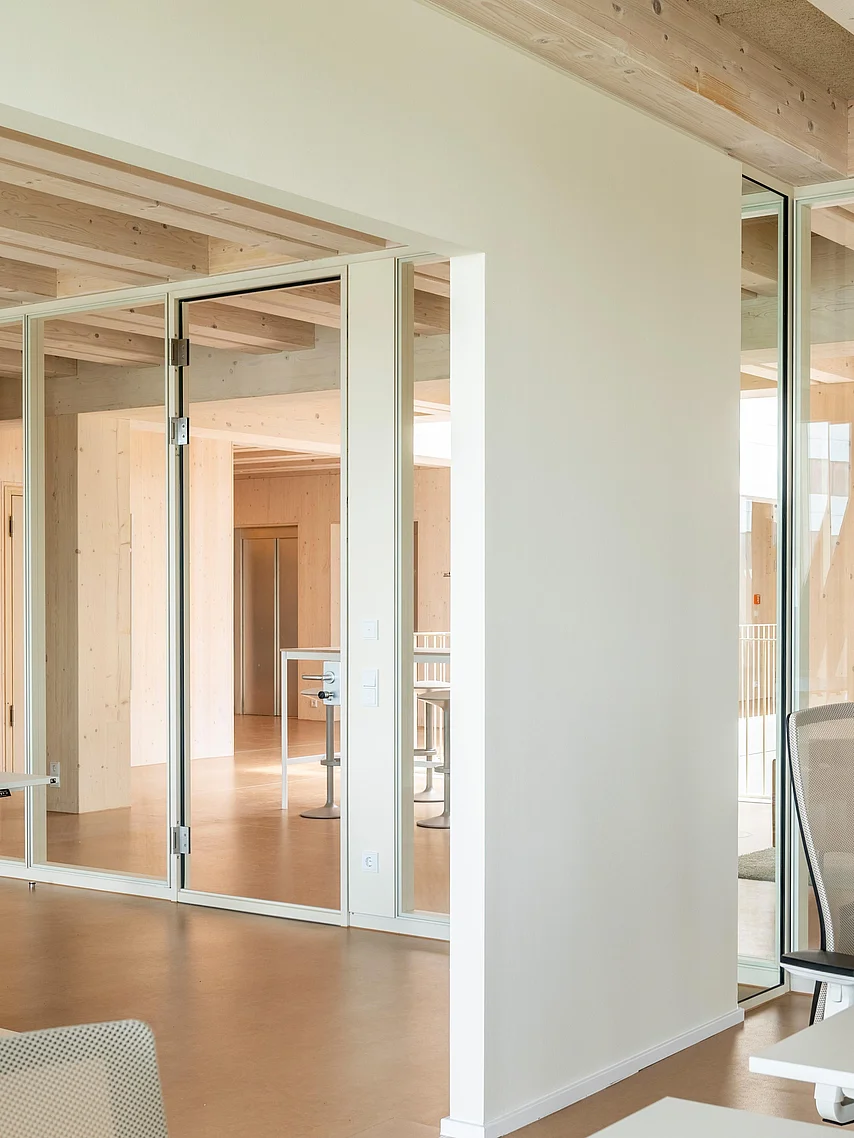 Der Innenausbau wurde farblich passend zur Holzkonstruktion gestaltet. Zum Einsatz kamen Trennwandsysteme und Glastüren von Goldbach Kirchner, insbesondere das System T35 mit Zweischeiben-Verglasung. Die filigranen Glasrahmen sind in RAL 1013 Perlweiß gehalten, harmonisch passend zur tragenden Holzkonstruktion. Die Ganzglastüren erreichen 37 dB Schallschutz. Neben den Türen sind Schalterblenden mit Überströmelementen eingebaut.