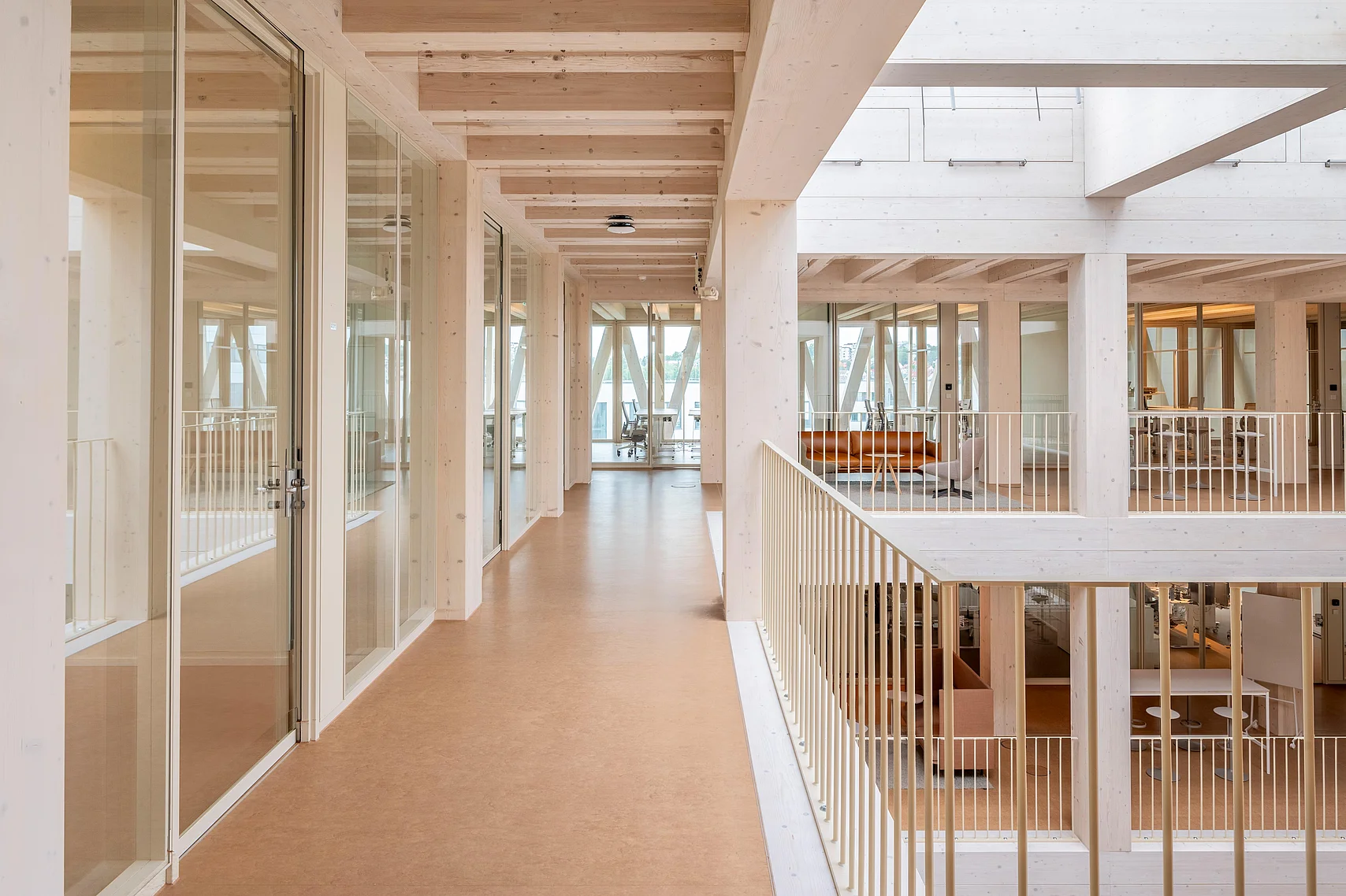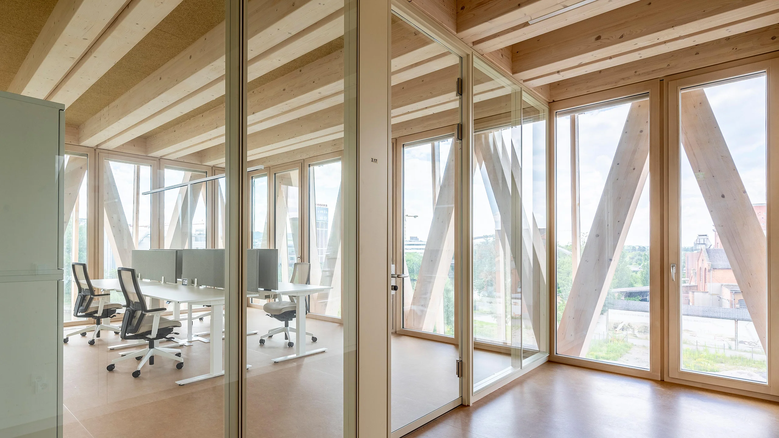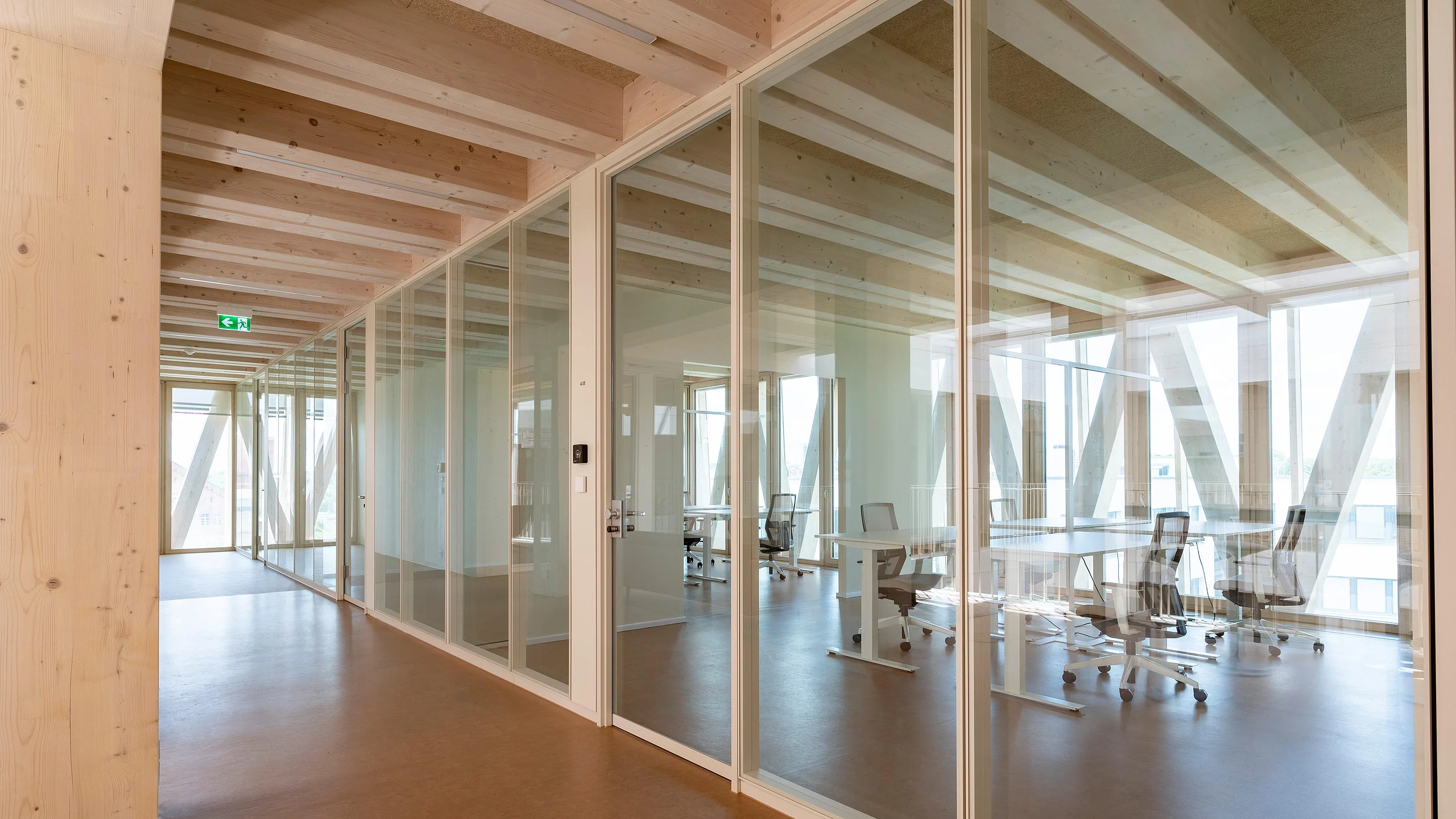 Der Innenausbau wurde farblich passend zur Holzkonstruktion gestaltet. Zum Einsatz kamen Trennwandsysteme und Glastüren von Goldbach Kirchner, insbesondere das System T35 mit Zweischeiben-Verglasung. Die filigranen Glasrahmen sind in RAL 1013 Perlweiß gehalten, harmonisch passend zur tragenden Holzkonstruktion. Die Ganzglastüren erreichen 37 dB Schallschutz. Neben den Türen sind Schalterblenden mit Überströmelementen eingebaut.