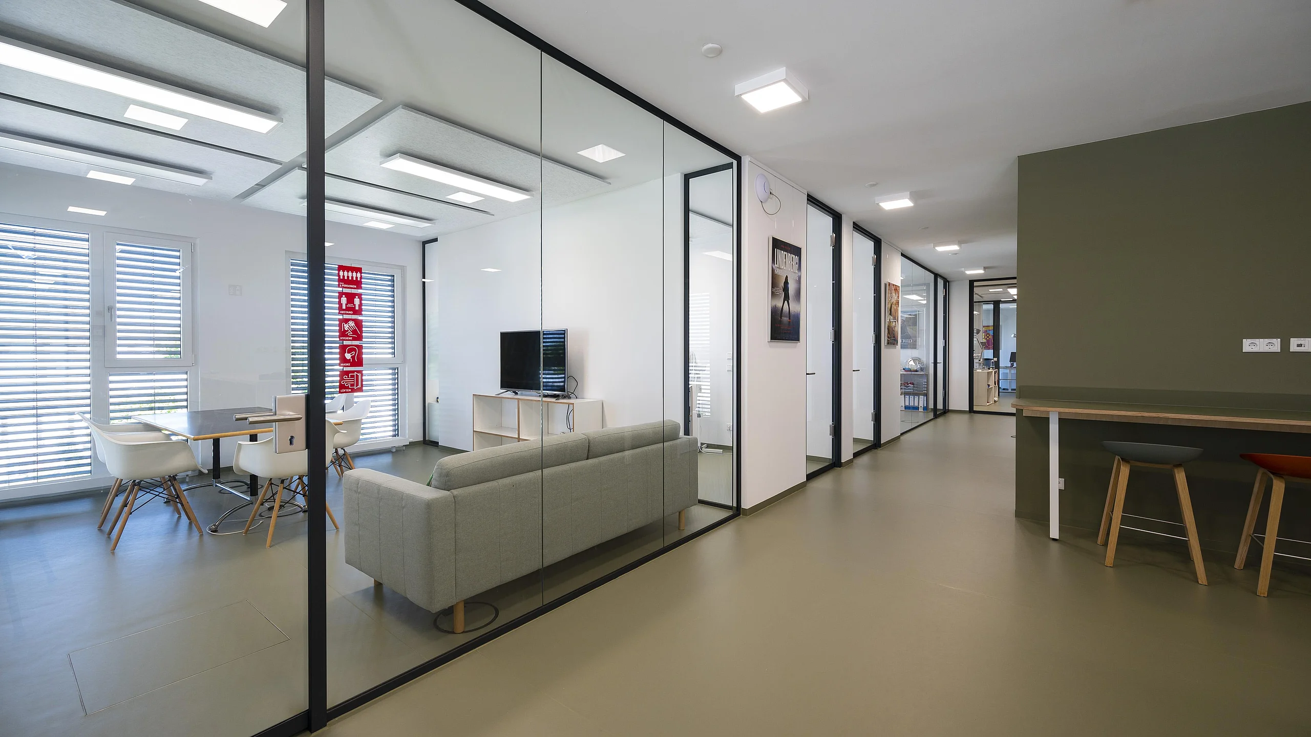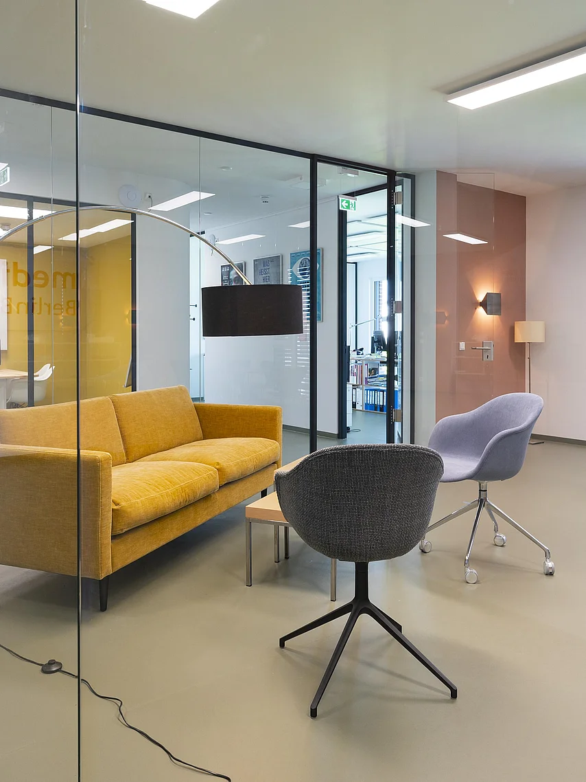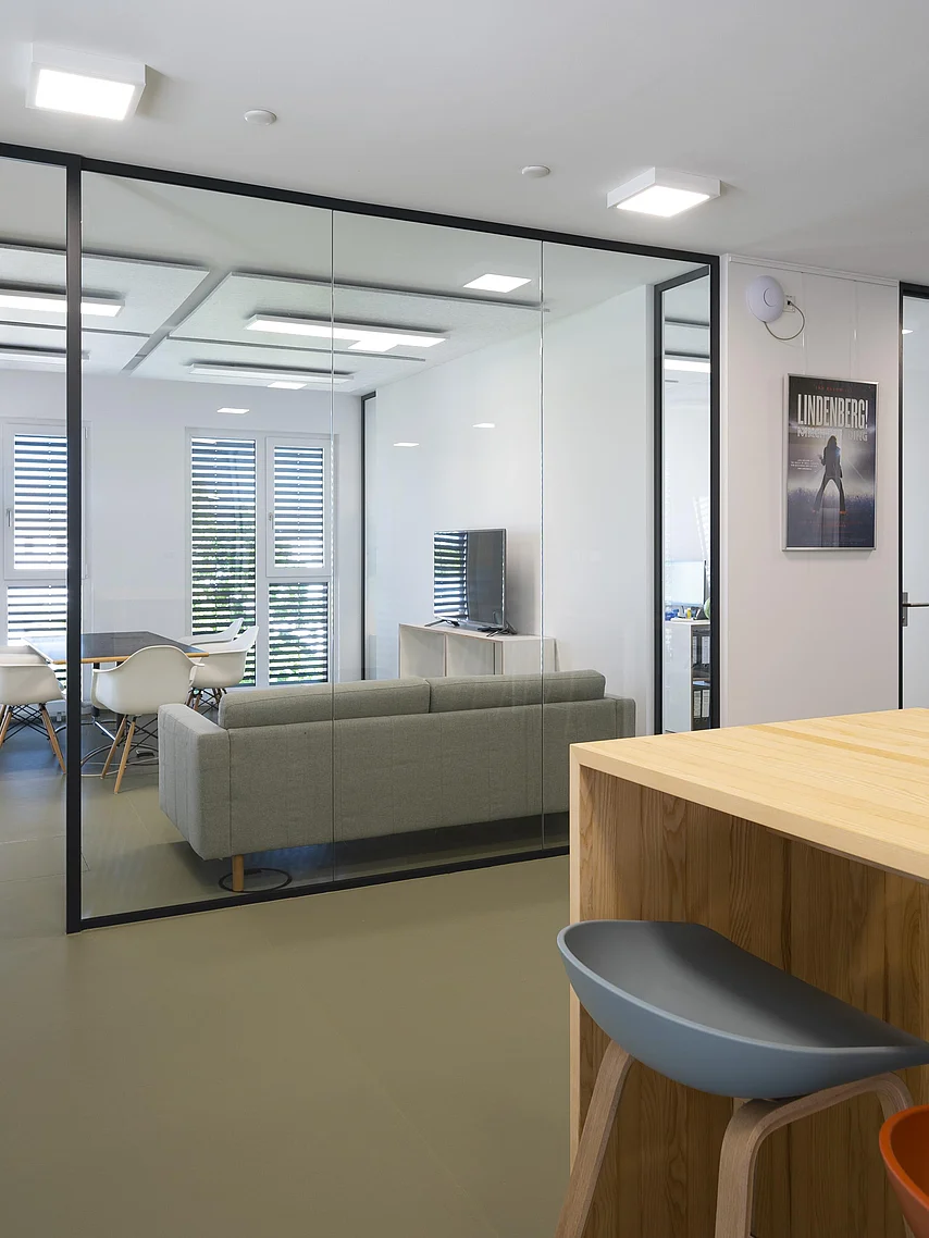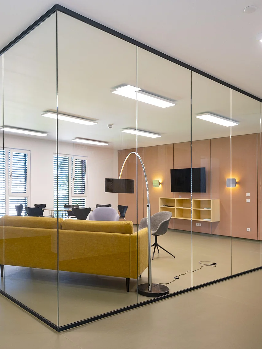 Ein herausragendes Beispiel für eine gelungene Umsetzung moderner Arbeitsräume sind die Büroflächen und Meetingbereiche, in denen das Ganzglas-Trennwandsystem T50 von Goldbach Kirchner eingesetzt wurde. Die transparenten Trennwände ermöglichen lichtdurchflutete Arbeitsräume und schaffen eine offene Atmosphäre, die die Kreativität und Zusammenarbeit fördert.