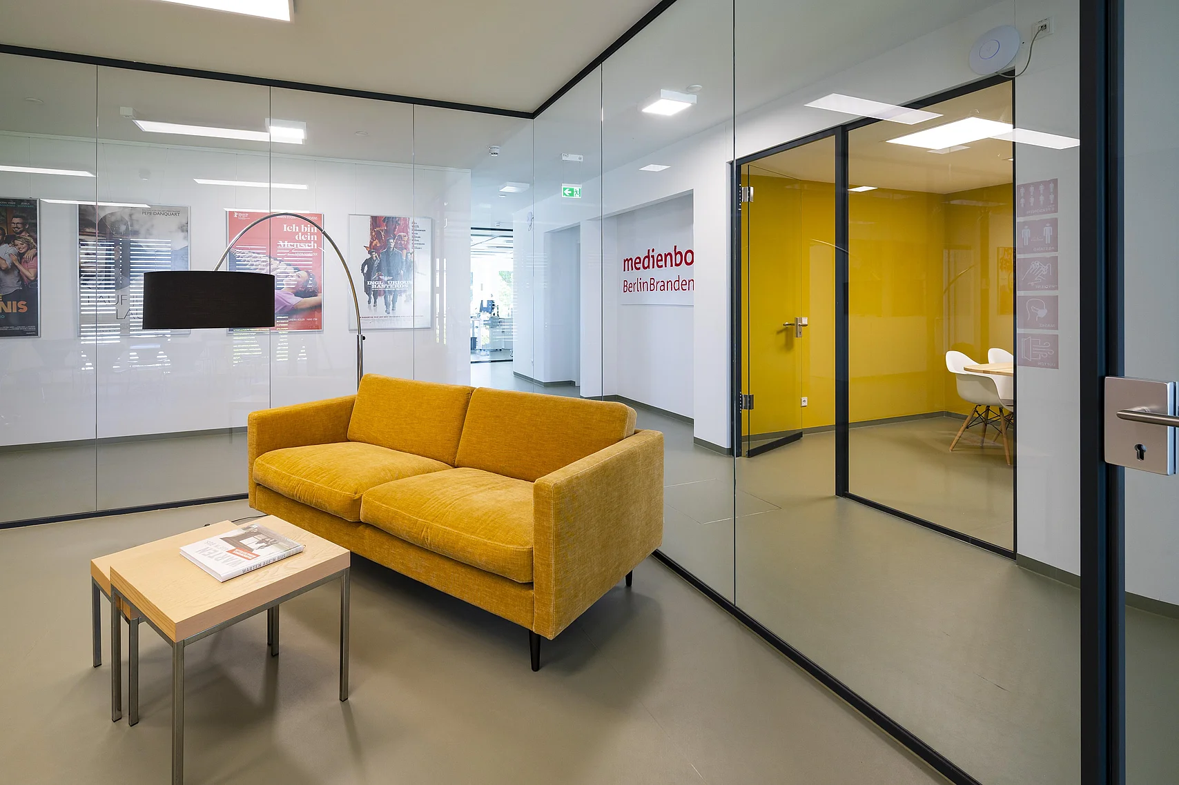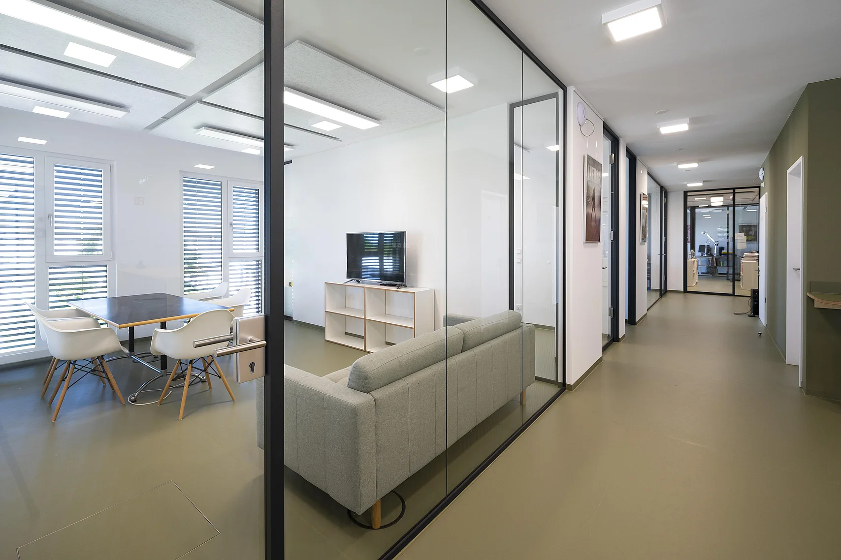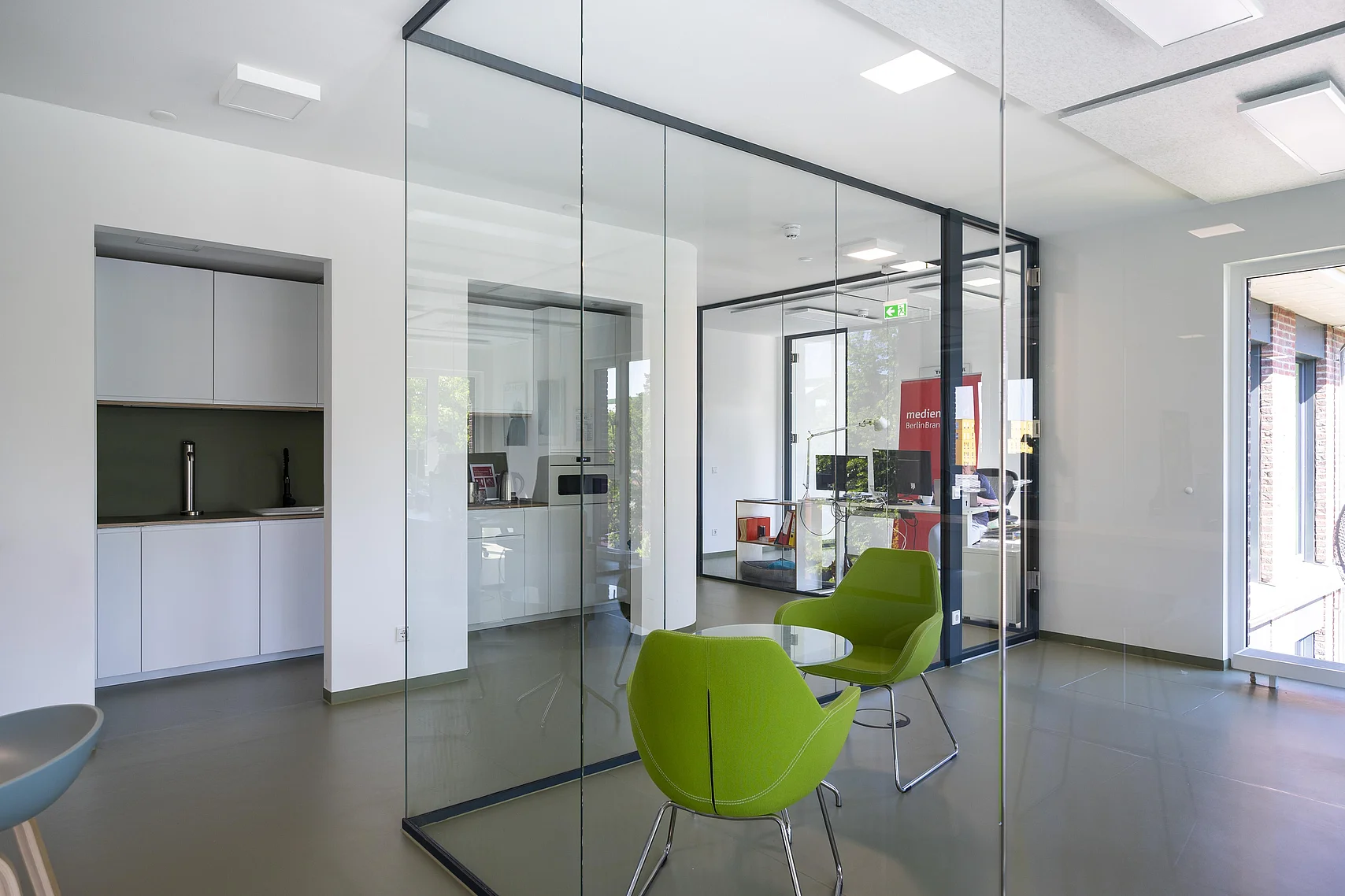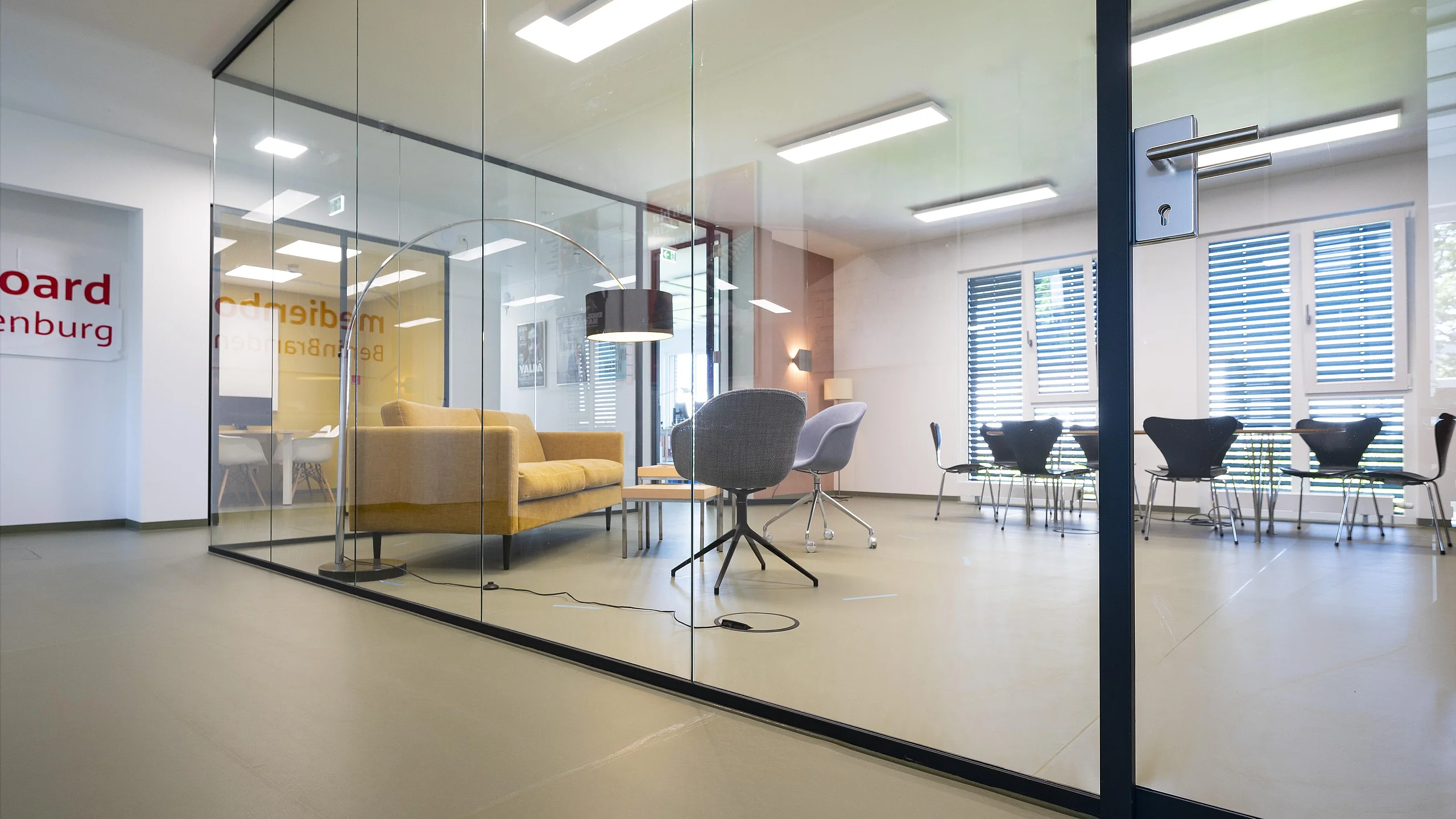 Ein herausragendes Beispiel für eine gelungene Umsetzung moderner Arbeitsräume sind die Büroflächen und Meetingbereiche, in denen das Ganzglas-Trennwandsystem T50 von Goldbach Kirchner eingesetzt wurde. Die transparenten Trennwände ermöglichen lichtdurchflutete Arbeitsräume und schaffen eine offene Atmosphäre, die die Kreativität und Zusammenarbeit fördert.