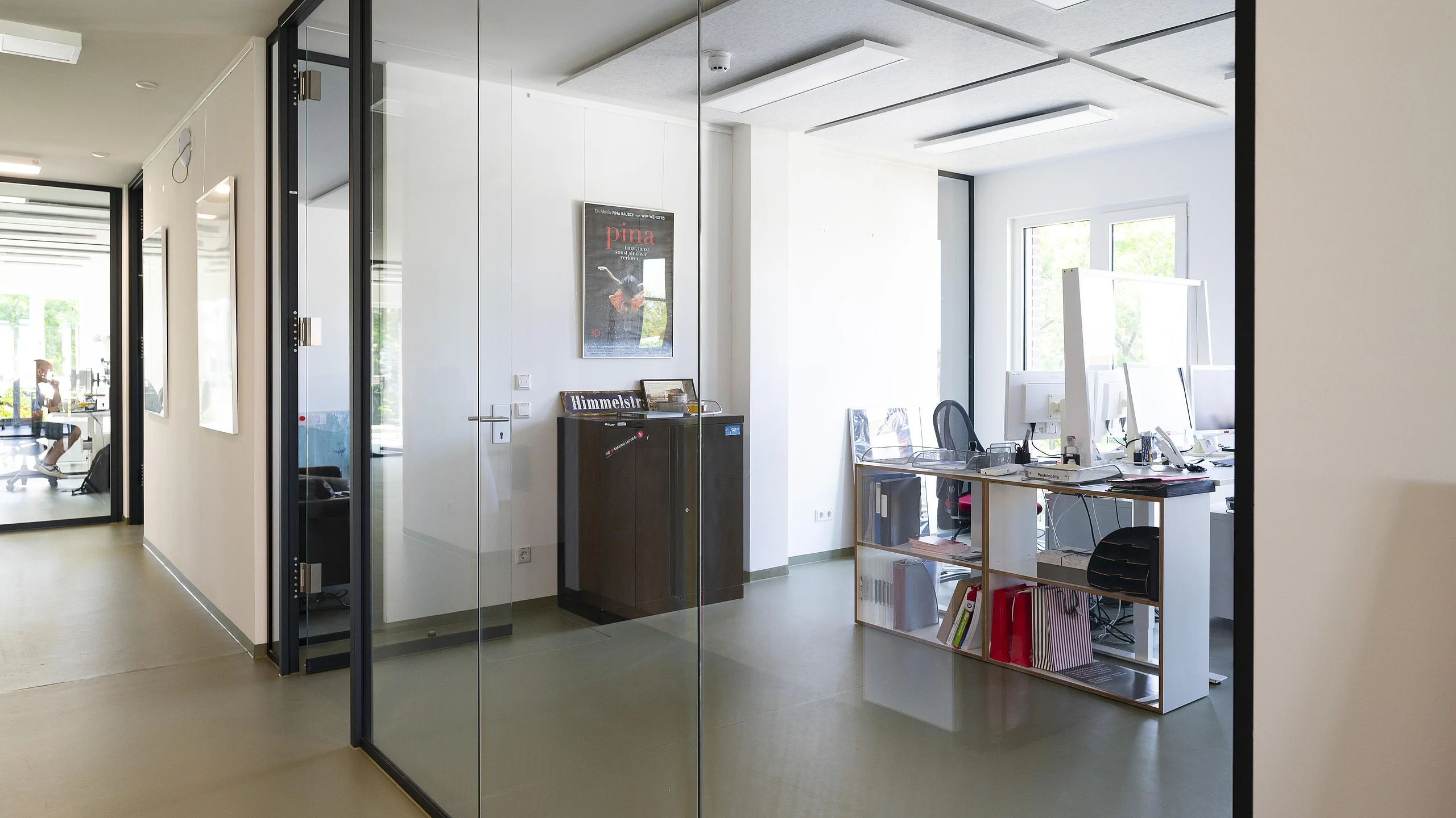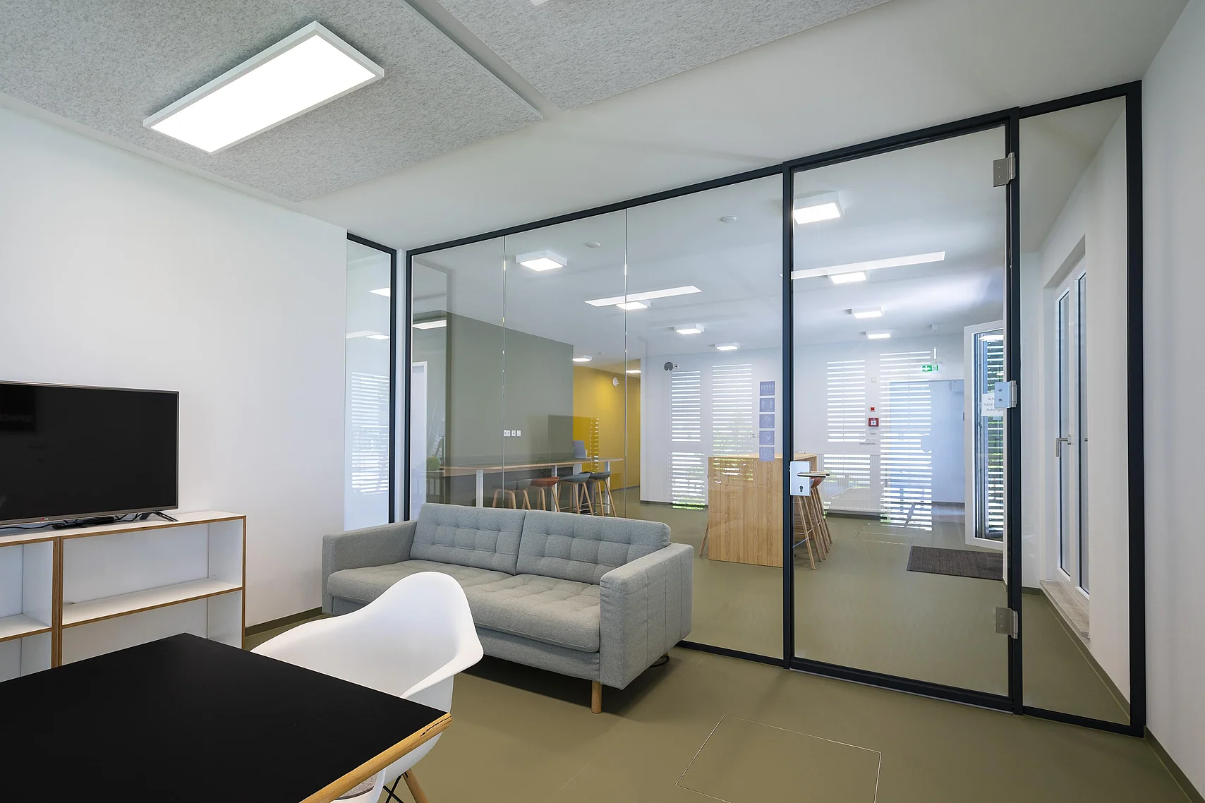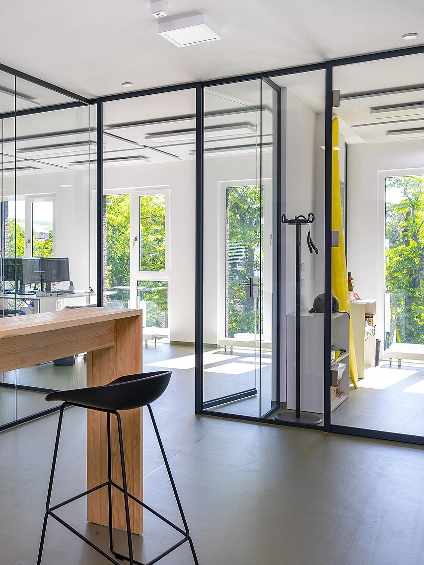 Das Trennwandsystem T50 zeichnet sich durch raumhohe Einscheibenverglasung, elegante schwarze Profile und filigrane Leichtigkeit aus. Die klare Linienführung und das moderne Design tragen nicht nur zur ästhetischen Gestaltung der Räumlichkeiten bei, sondern schaffen auch eine angenehme Arbeitsumgebung. Die transparenten Trennwände ermöglichen zudem eine flexible Raumgestaltung und schaffen eine Verbindung zwischen verschiedenen Arbeitsbereichen.