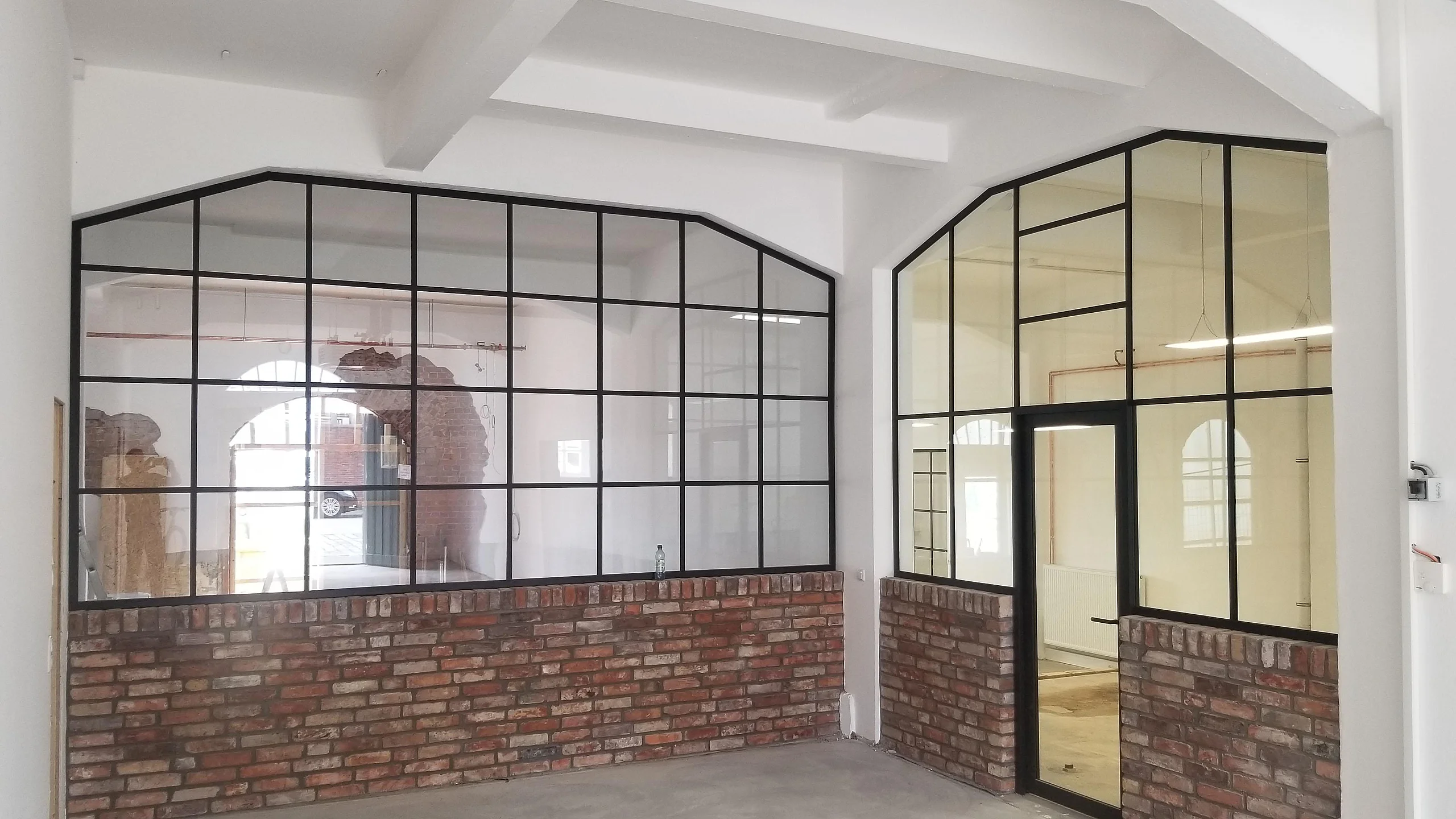 Die nichttragende innere Trennwand mit Einscheiben-Verglasung wird mit Aluminium U-Profilen am Baukörper angeschlossen. Leicht und fast schwerelos können so Räume abgetrennt werden. Tragende Elemente sind auf ein Mindestmaß reduziert, die Glasflächen lassen die vorhandene Raumarchitektur wirken.