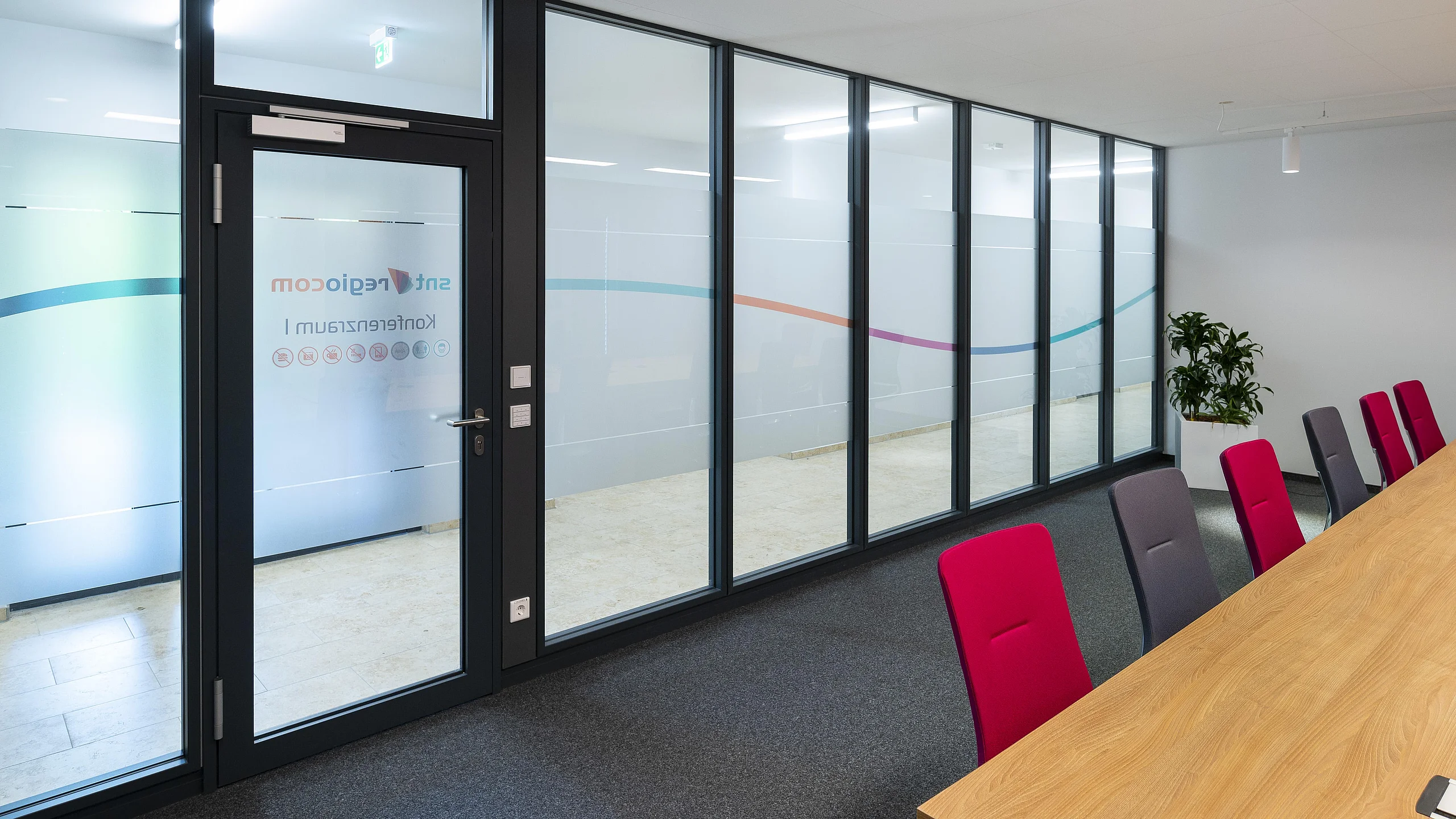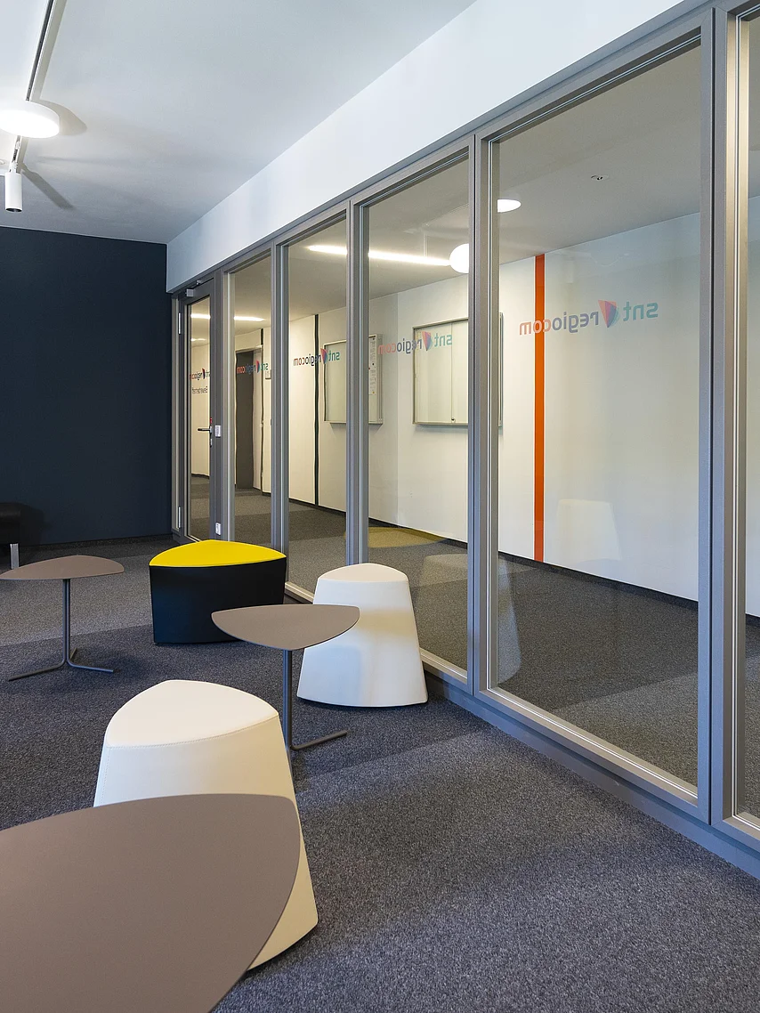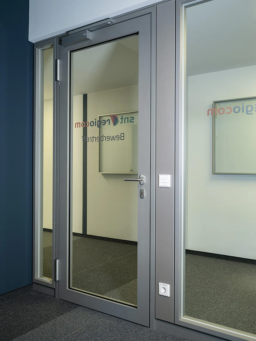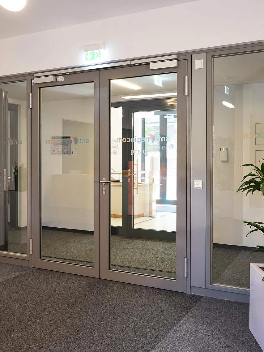 Auf Grund der baulichen Anforderungen war der Einbau einer Brandschutzwand flurseitig erforderlich. Erfüllt wurde dies mit dem Goldbach Kirchner Trennwandsystem T46 mit mittig liegender Brandschutz-Verglasung F30. Die Durchgänge sind mit Alu-Rahmentüren F30, teilweise doppelflüglig und mit Obentürschließer mit integrierter Schließfolgeregelung ausgestattet.