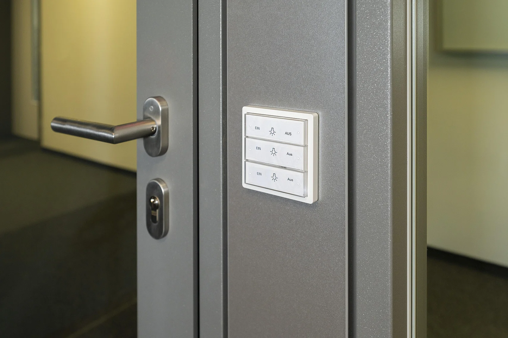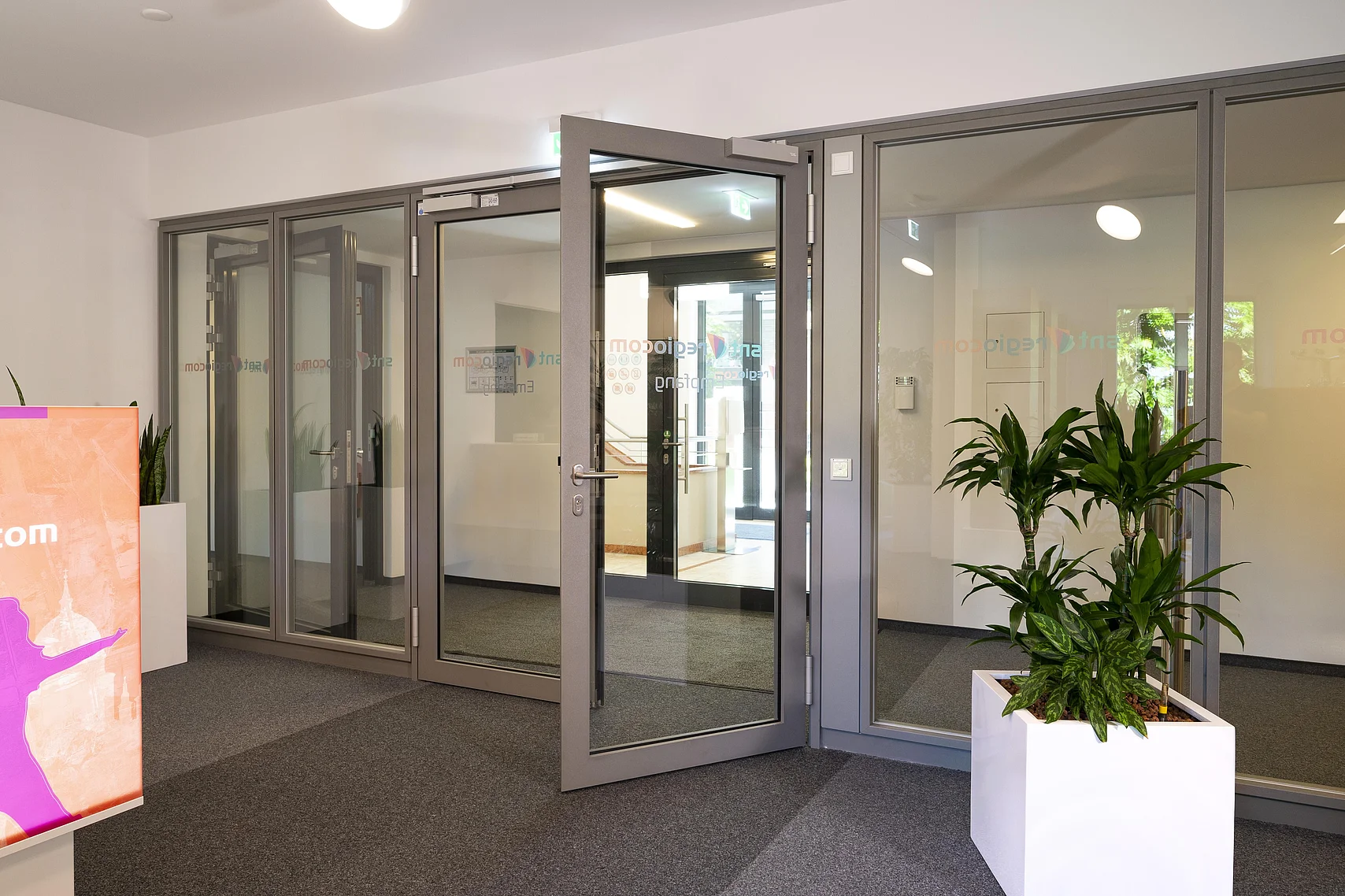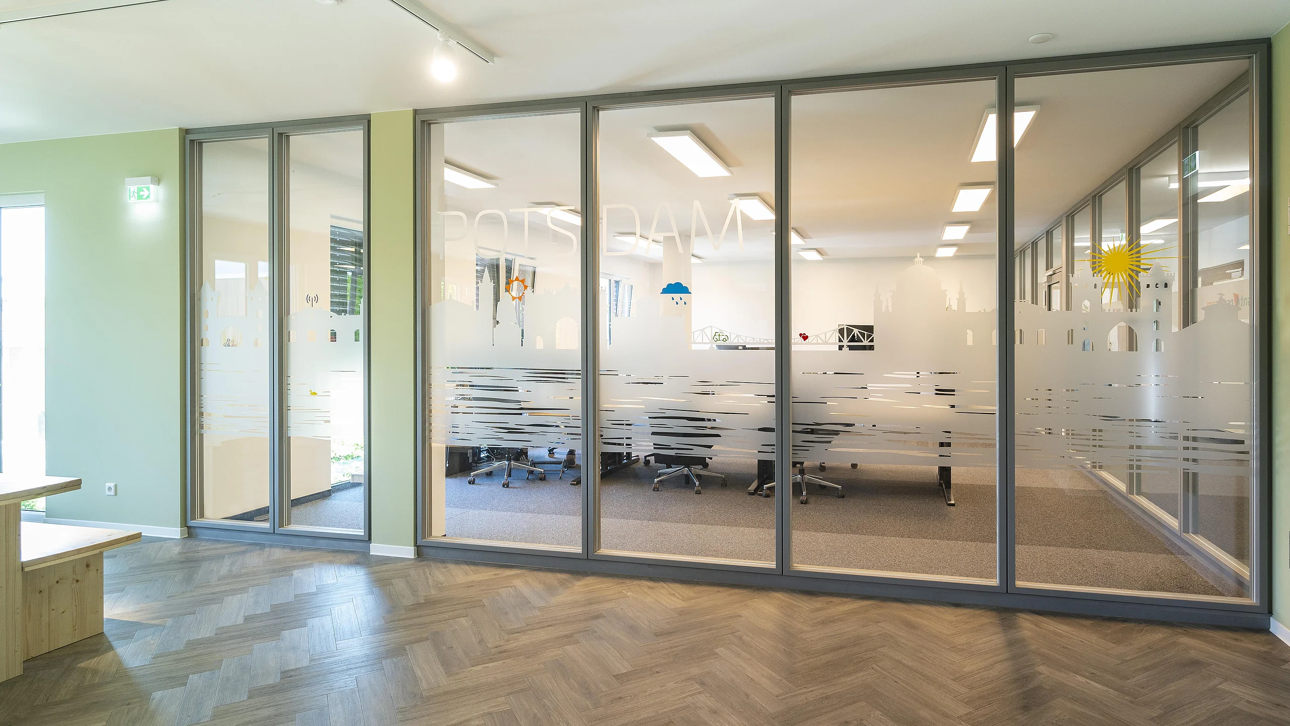 Auf Grund der baulichen Anforderungen war der Einbau einer Brandschutzwand flurseitig erforderlich. Erfüllt wurde dies mit dem Goldbach Kirchner Trennwandsystem T46 mit mittig liegender Brandschutz-Verglasung F30. Die Durchgänge sind mit Alu-Rahmentüren F30, teilweise doppelflüglig und mit Obentürschließer mit integrierter Schließfolgeregelung ausgestattet.