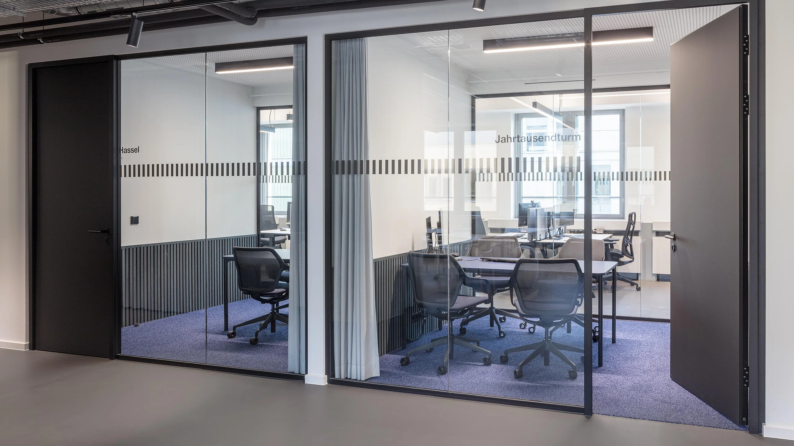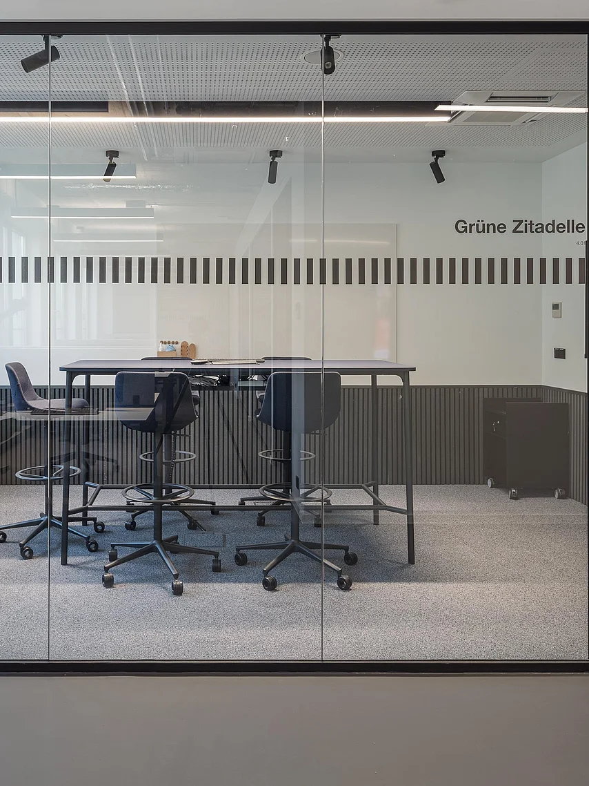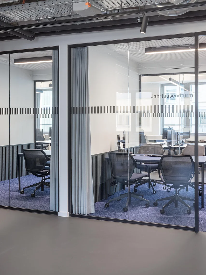 The desing concept was realised with the glas partition wall system T50 by Goldbach Kirchner. Delicate single-pane glazing and room-heigth full-panel doors create transparent yet discrete meeting rooms. They enable focused and confidental communication without being completely separated from the remaining proceedings in the bank.