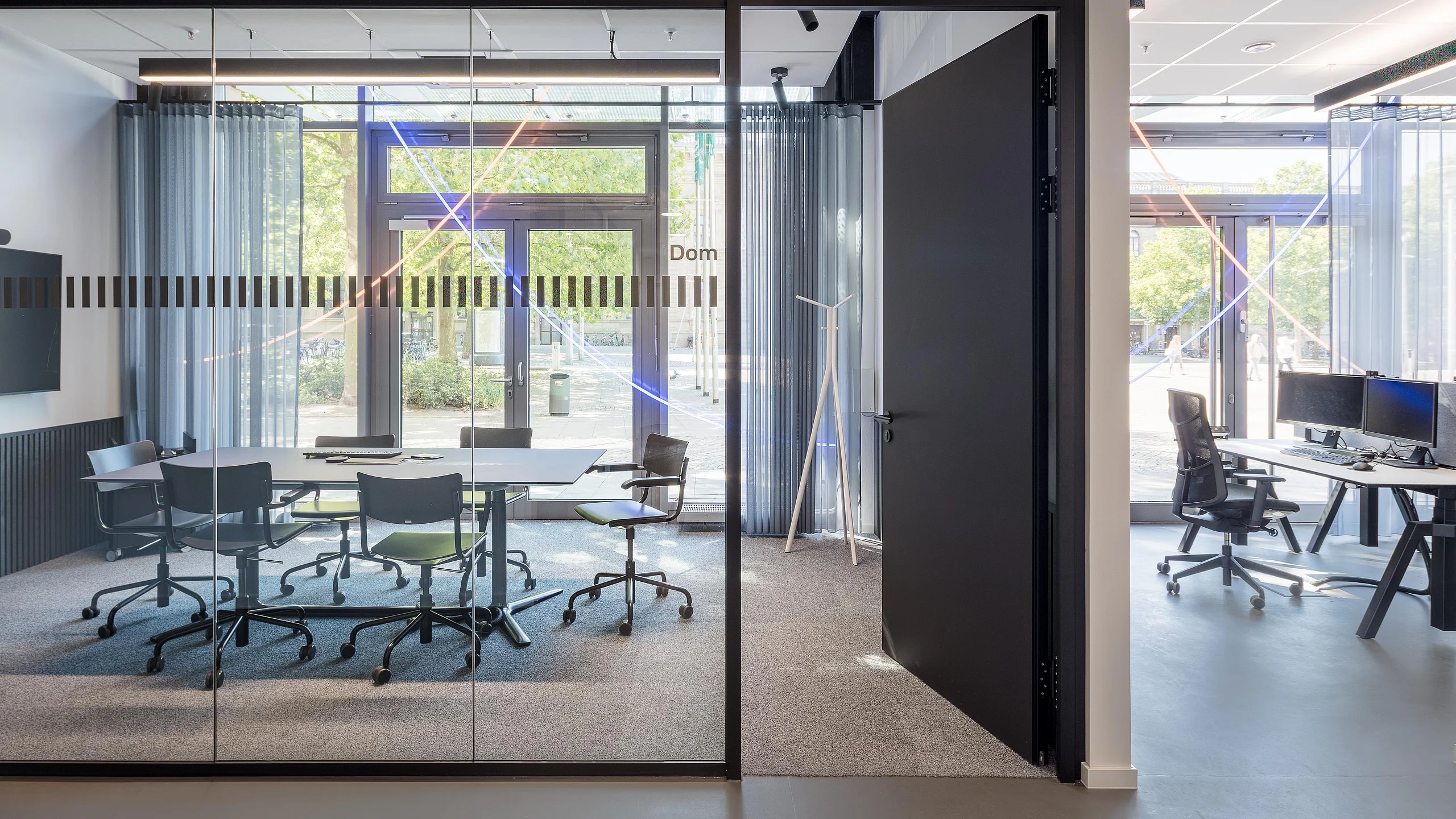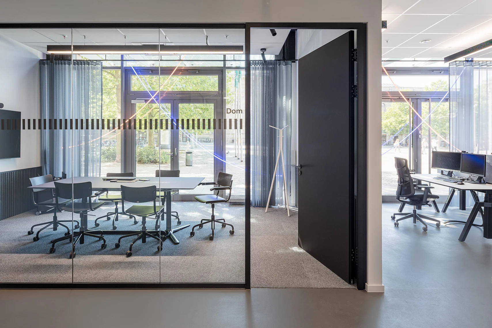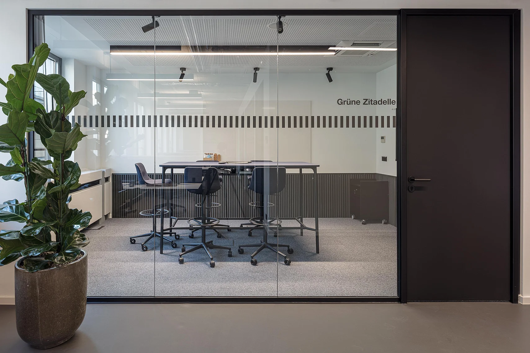The desing concept was realised with the glas partition wall system T50 by Goldbach Kirchner. Delicate single-pane glazing and room-heigth full-panel doors create transparent yet discrete meeting rooms. They enable focused and confidental communication without being completely separated from the remaining proceedings in the bank.