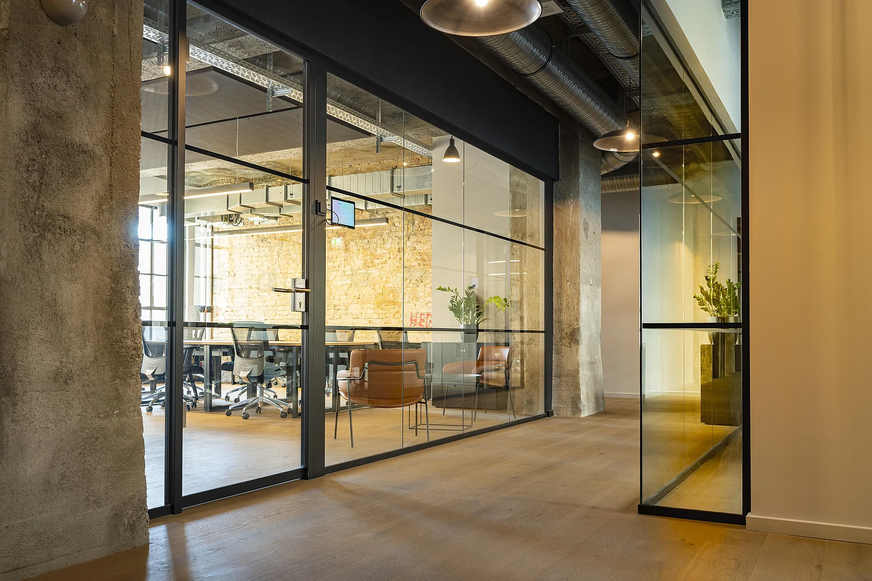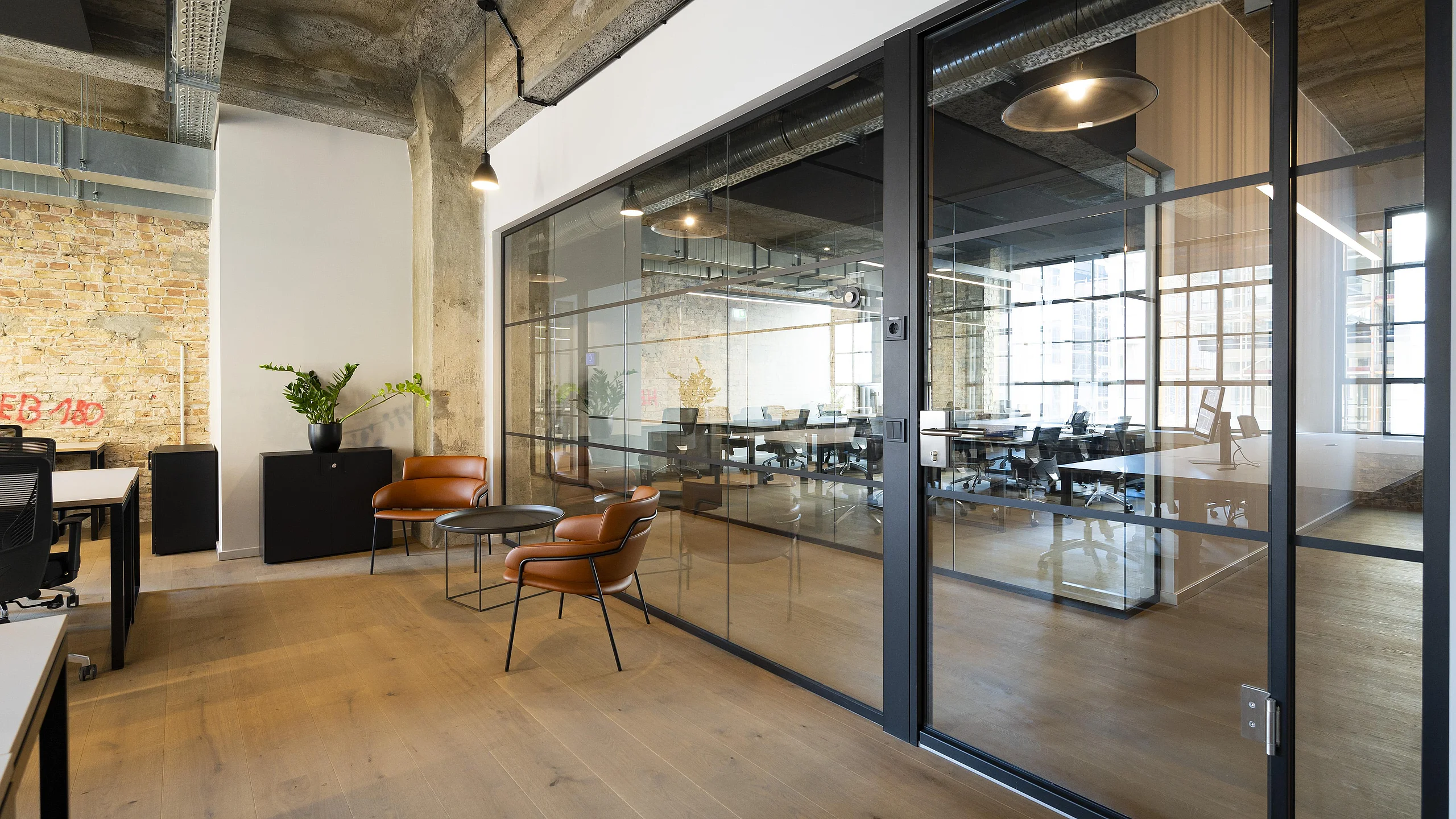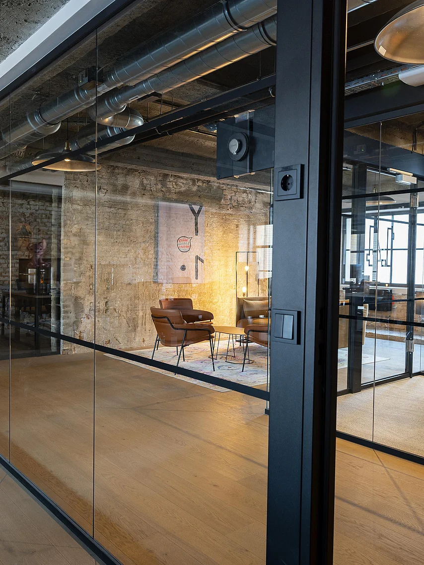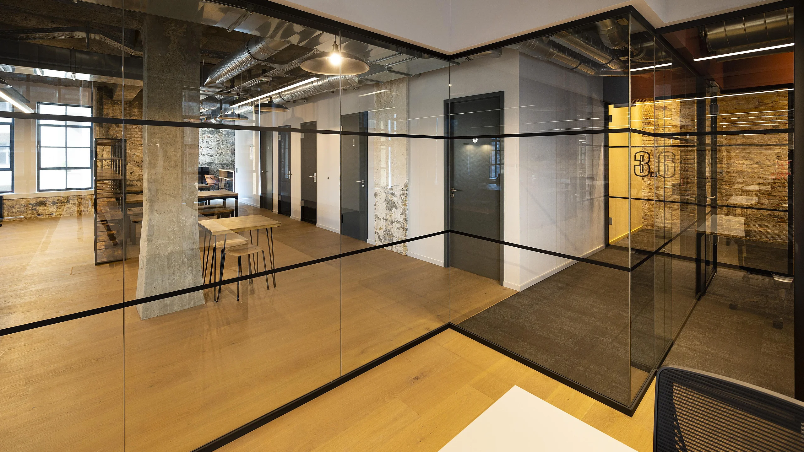 Neben dem Einsatz in modernen Gebäuden mit transparenter Architektur eignet sich die Ganzglaswand T50 auch zur Raumteilung in sanierten oder historischen Immobilien. Fast schwerelos können so Büroeinheiten abgetrennt werden. Tragende Elemente sind auf ein Mindestmaß reduziert, die Glasflächen lassen die vorhandene Raumarchitektur wirken. Im Industrial Style ist das System auch als T50 Loft erhältlich.