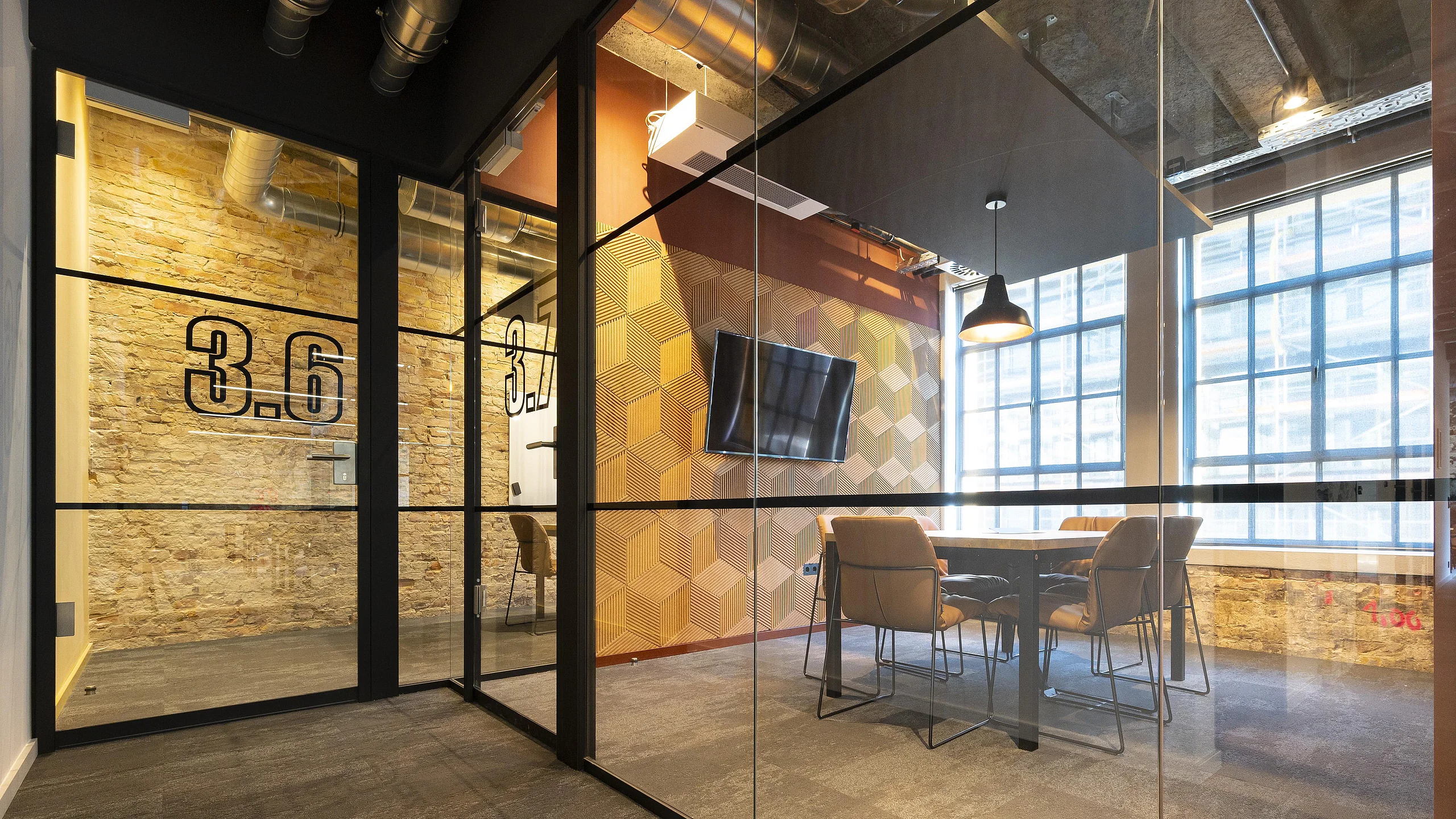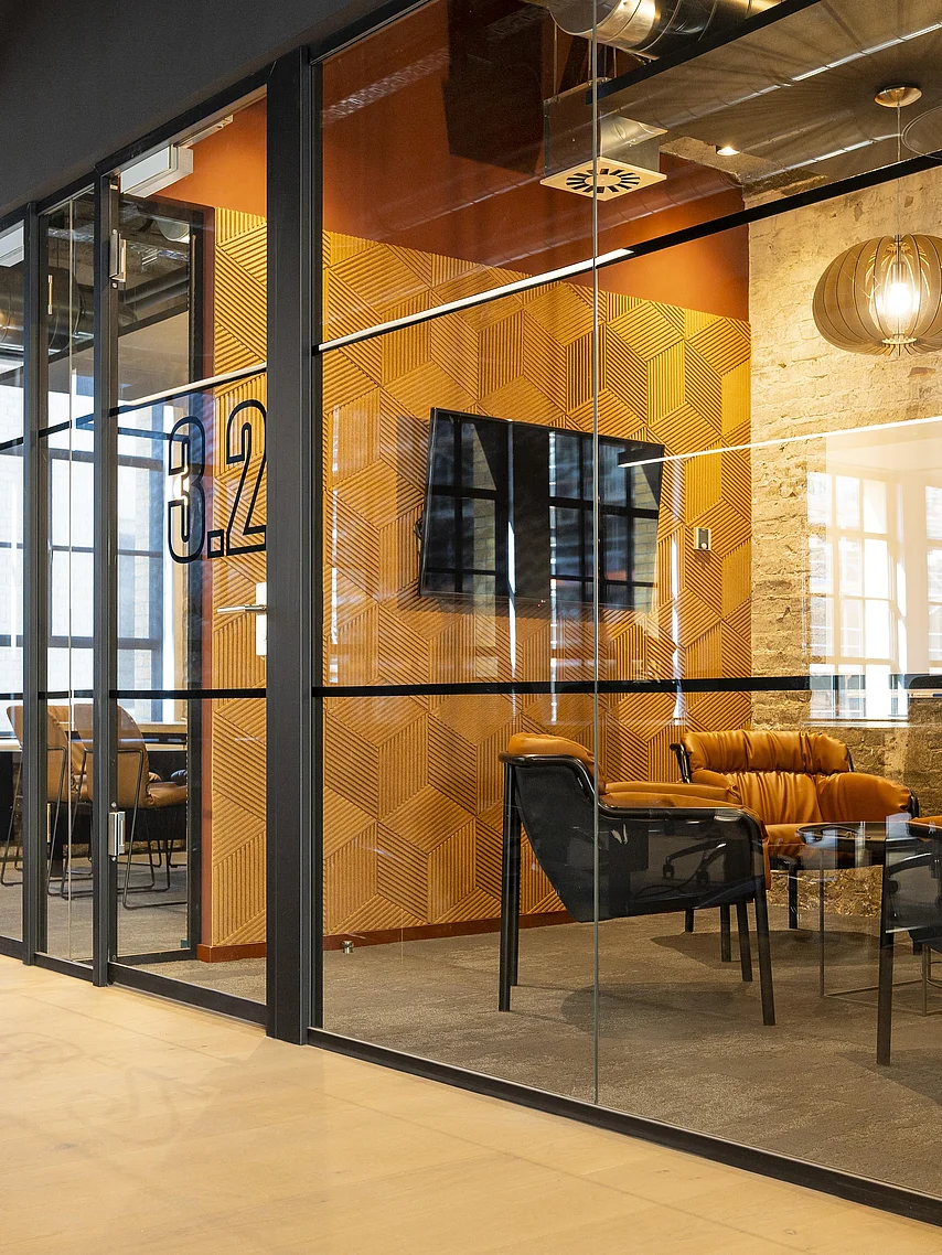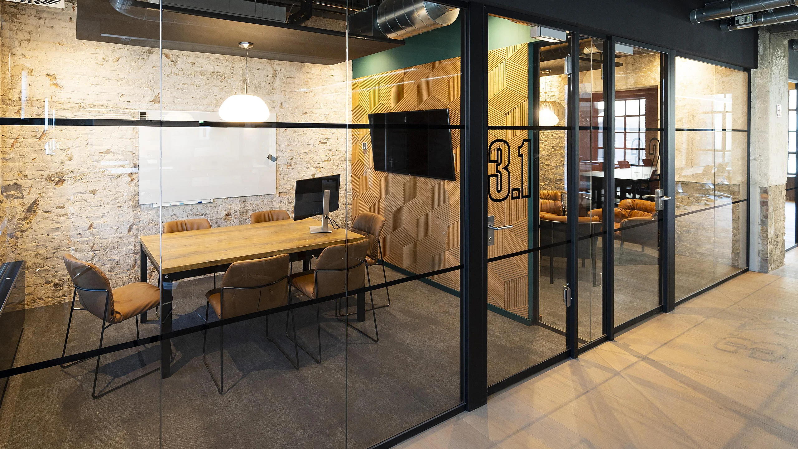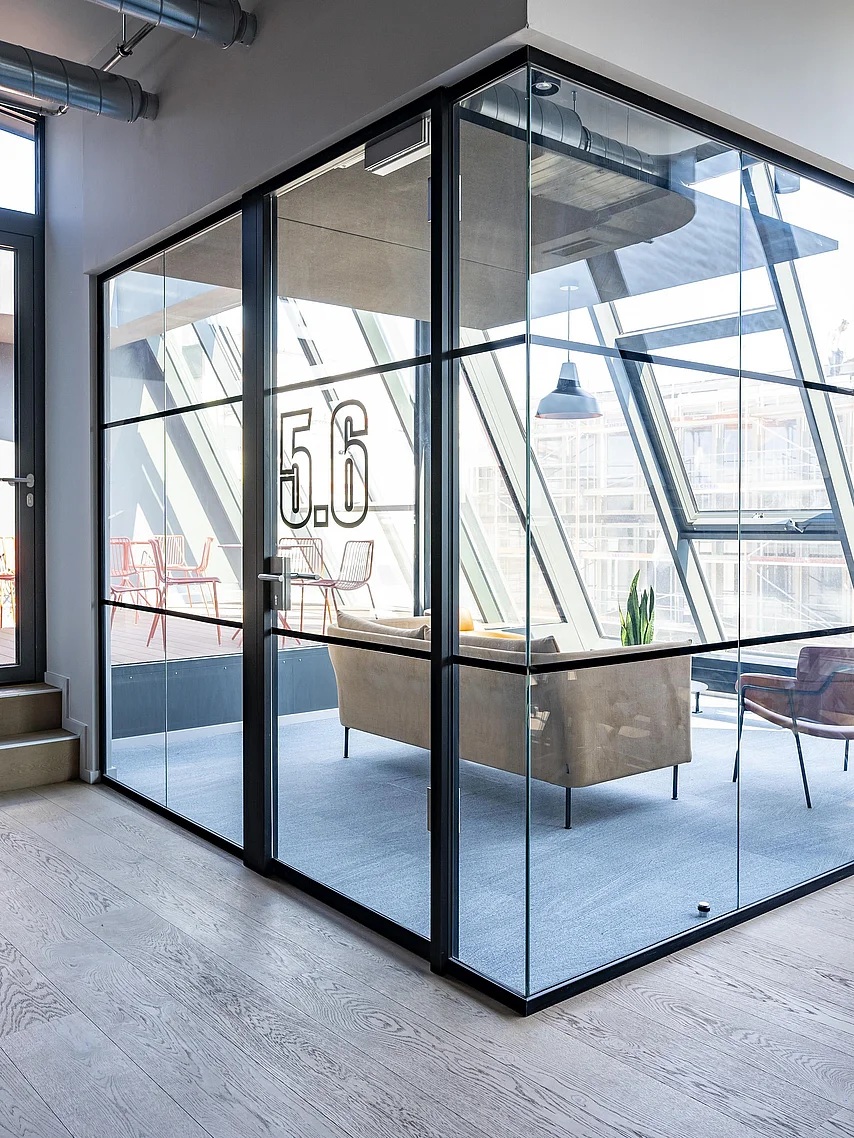 Zur akustischen Trennung der Räume wurde die ständerlosen Ganzglas-Trennwandsysteme T50 eingesetzt. Die Glasscheiben werden von oben und unten lediglich mit 27 mm schmalen Aluminiumprofilen fixiert.