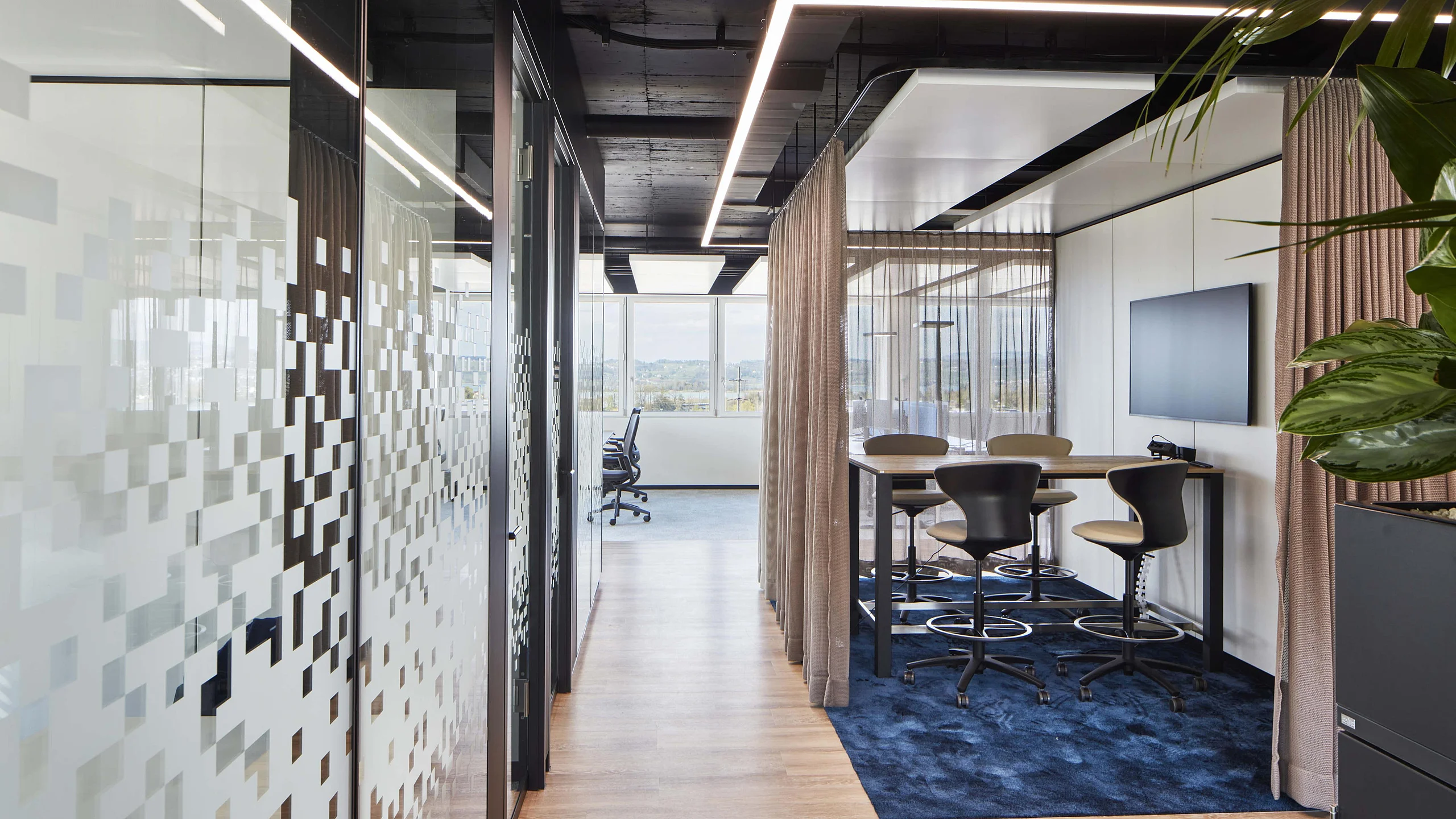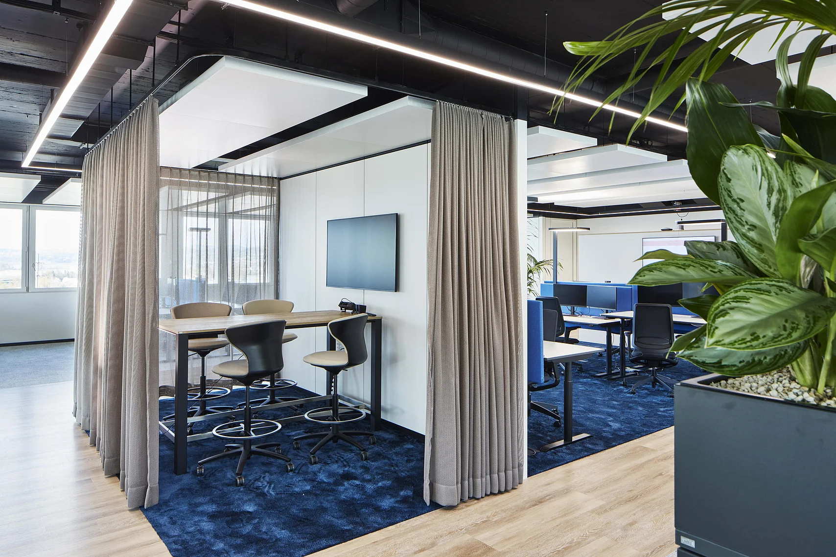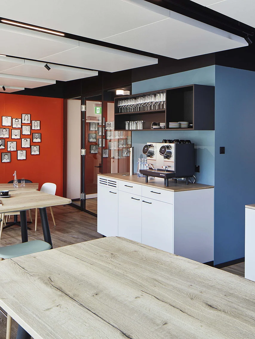 Mit der Glastrennwand T35 akustisch abgeschlossene Konferenzräume, entlang der Fensterfassade, können bei Bedarf durch Vorhänge auch optisch abgetrennt werden. Die an den Open Space Bereich angrenzende Kommunikationsinsel, ausgestattet mit Stehtisch, ist gedacht für kurze Teammeetings oder Videokonferenzen. Hier verschwindet die Technik in der geschossenen Trennwand T10. Ein, von der Decke abgehängtes, Vorhangsystem bietet auch hier bei Bedarf eine optische Abtrennung.