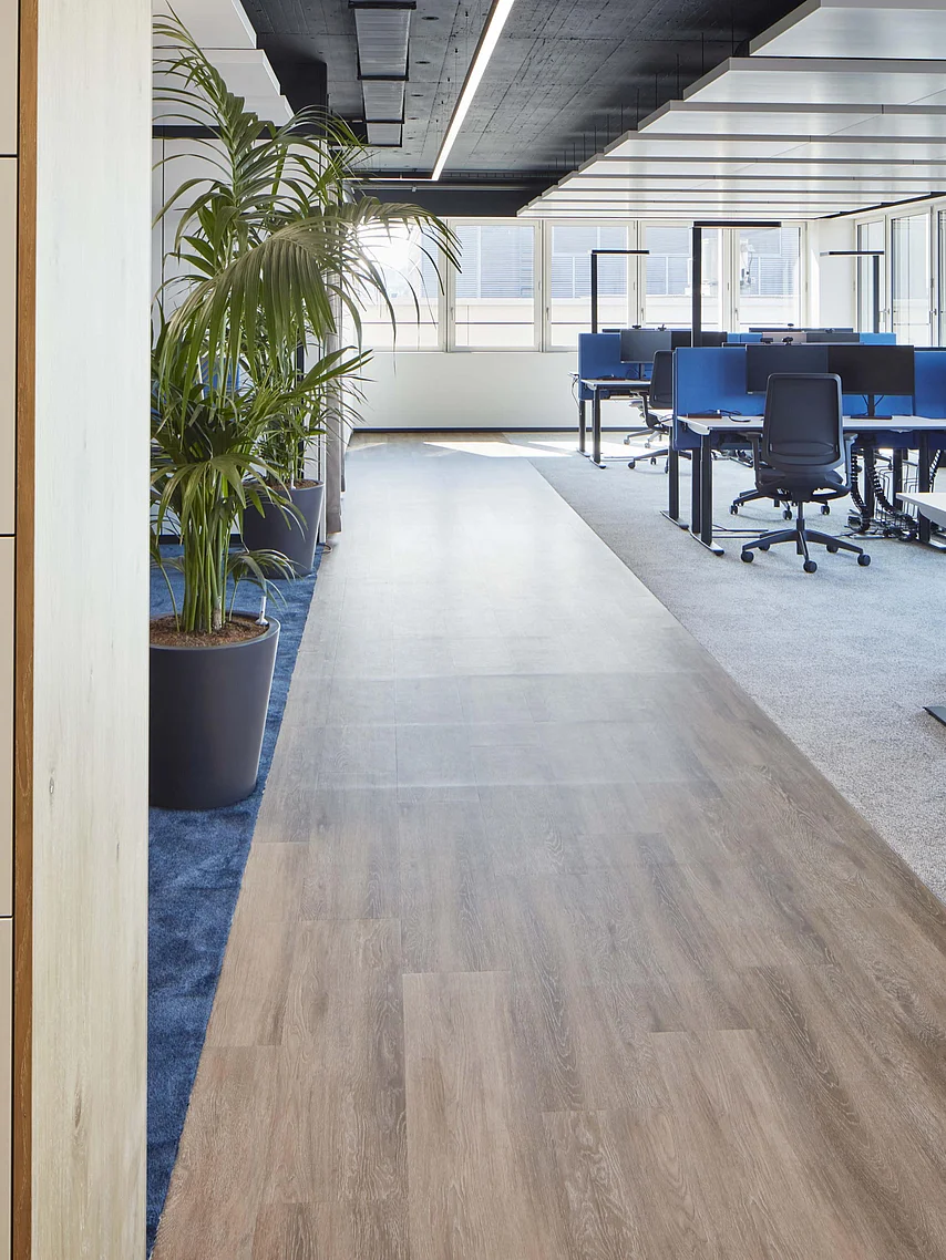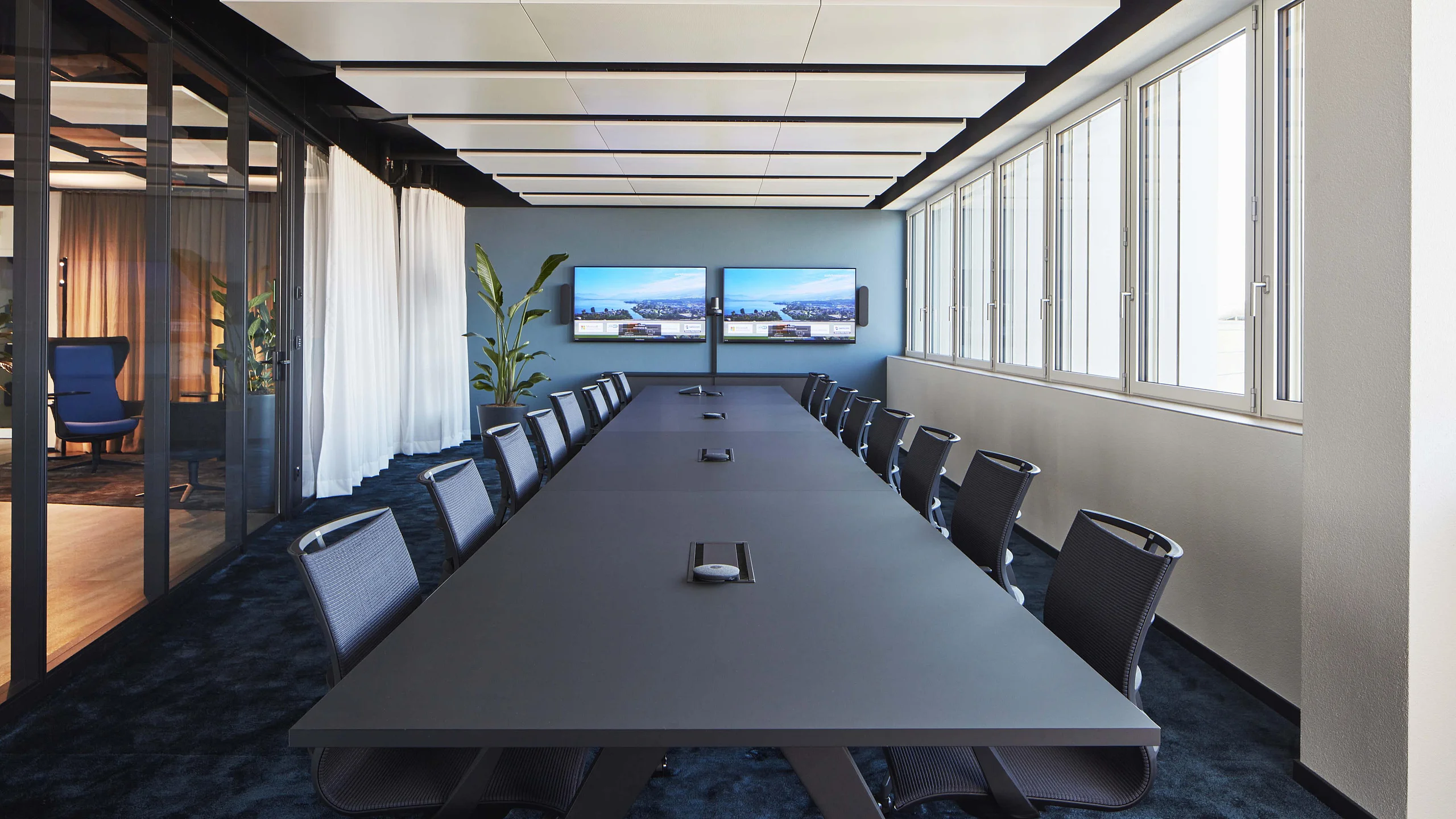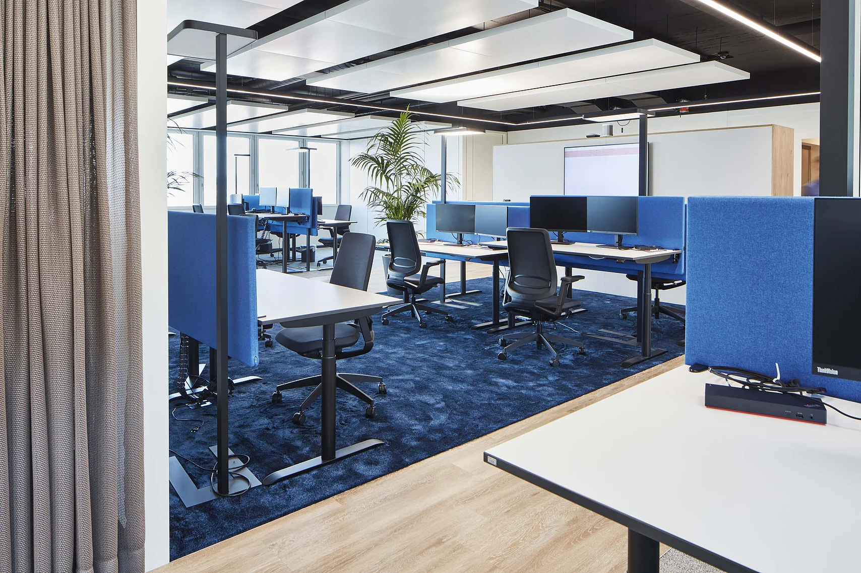 Mit der Glastrennwand T35 akustisch abgeschlossene Konferenzräume, entlang der Fensterfassade, können bei Bedarf durch Vorhänge auch optisch abgetrennt werden. Die an den Open Space Bereich angrenzende Kommunikationsinsel, ausgestattet mit Stehtisch, ist gedacht für kurze Teammeetings oder Videokonferenzen. Hier verschwindet die Technik in der geschossenen Trennwand T10. Ein, von der Decke abgehängtes, Vorhangsystem bietet auch hier bei Bedarf eine optische Abtrennung.