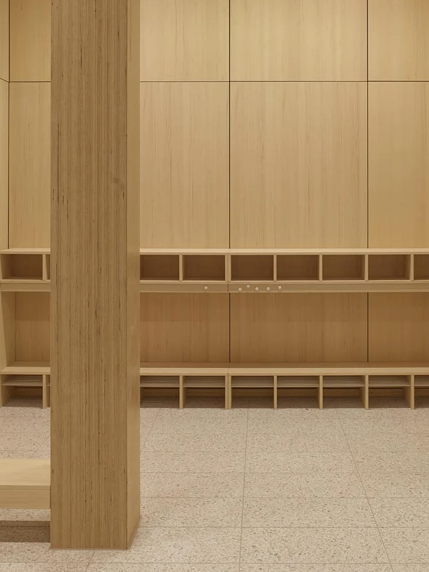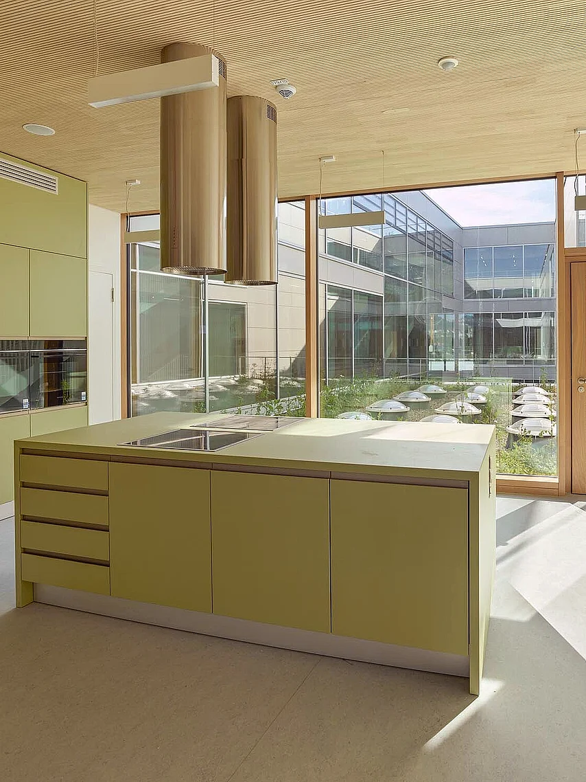 Innerhalb des Gebäudes spiegelt sich dieser Anspruch in einem hochwertigen Innenausbau wider. Durch maßgefertigte Einbauten wie Sitzstufen, Garderoben und Regale wurde eine angenehme Lern- und Aufenthaltsatmosphäre geschaffen. Die zurückhaltende Gestaltung unterstützt die vielfältige und flexible Nutzung des Hauses visuell. In der Sporthalle sorgen moderne Sitzmöglichkeiten, angelehnt an die Funktion einer Tribüne, für Komfort und laden zum Aufenthalt ein. Individuelle Einbauküchen folgen der Idee langlebiger, funktionaler Räume, die den täglichen Anforderungen des Bildungshauses standhalten. Ein Tanzraum mit integrierter Spiegelwand und Ballettstangen rundet das pädagogische Konzept ab.
